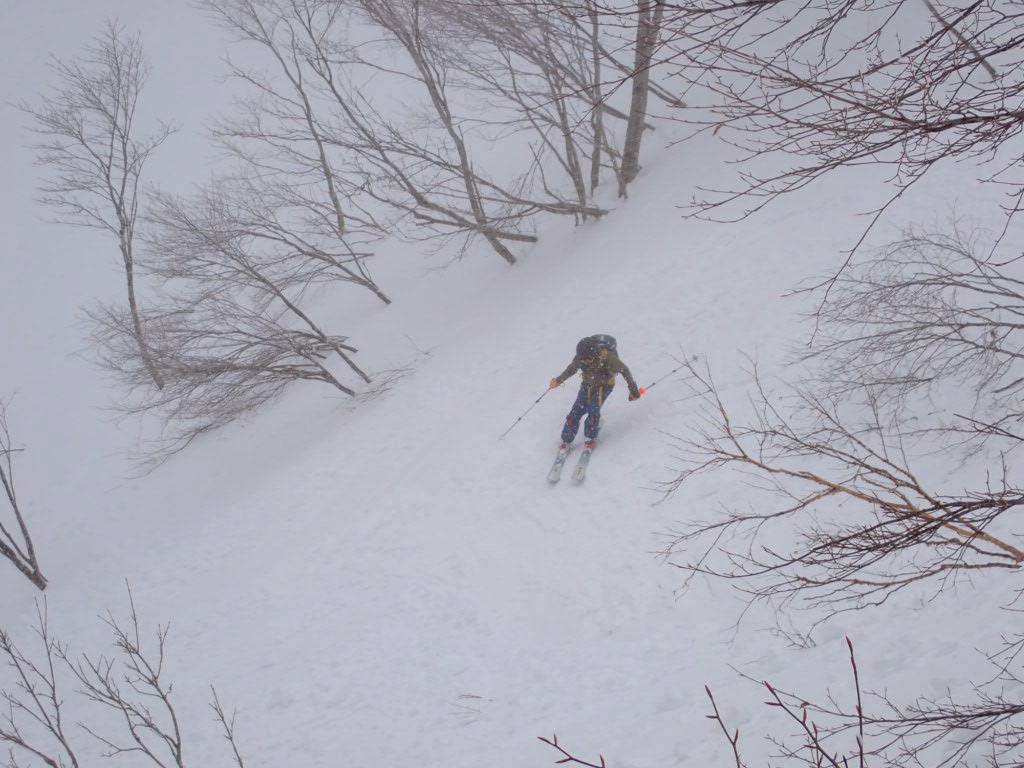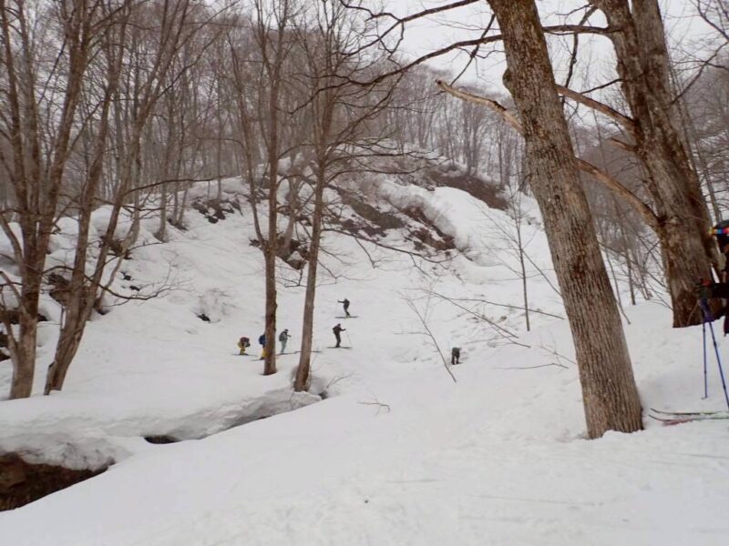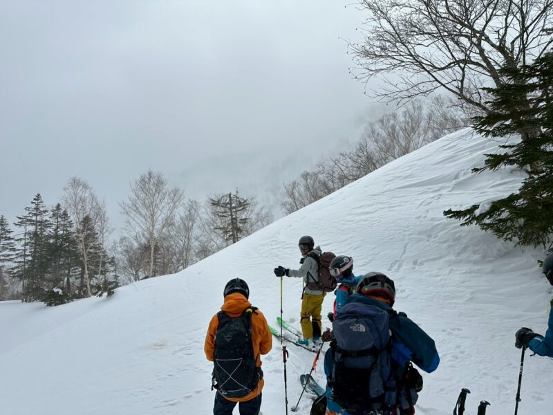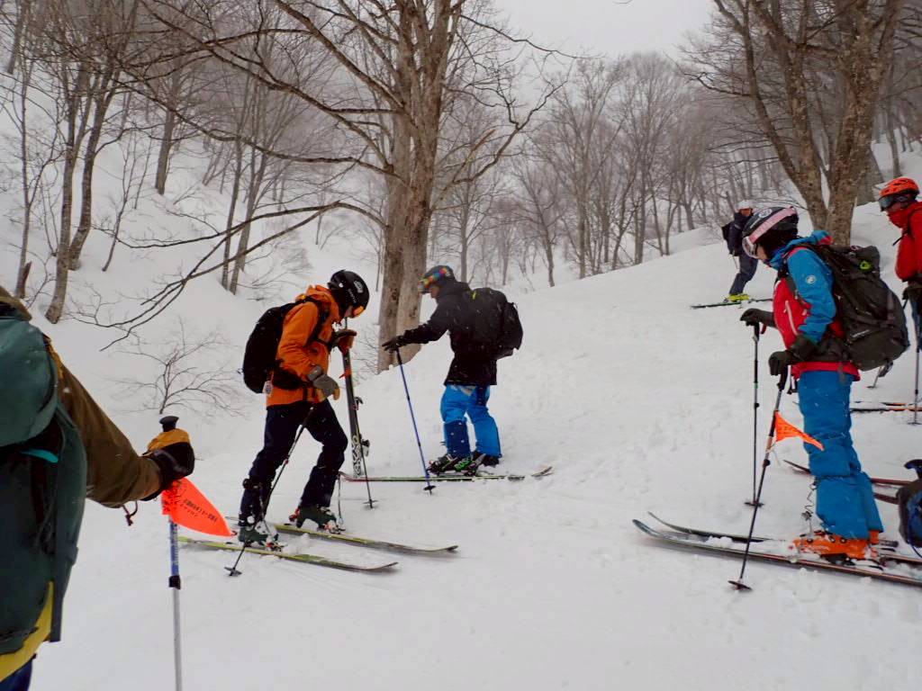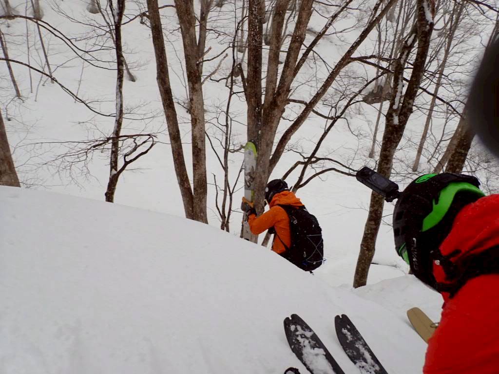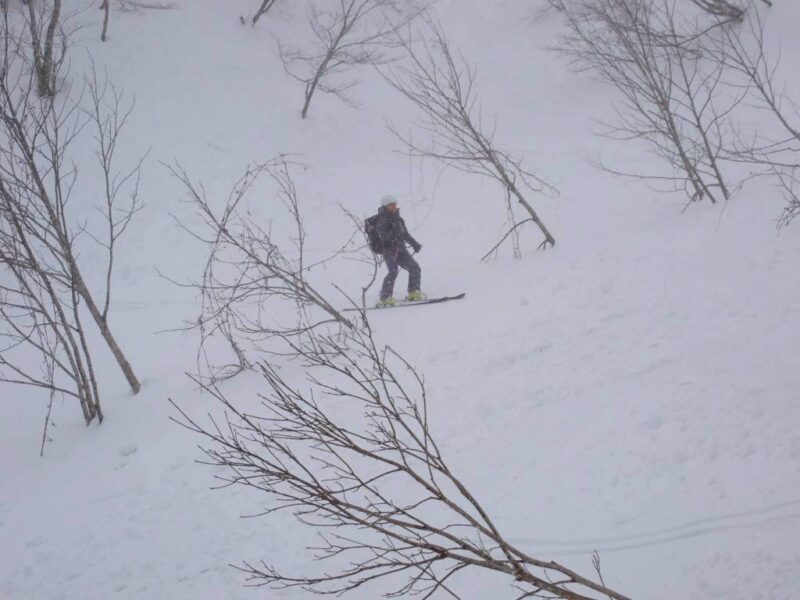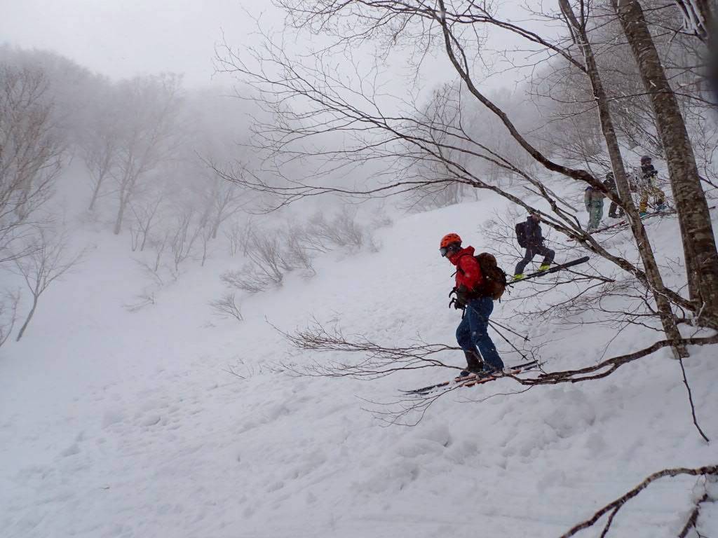 ここでリーダーが的確に判断し、スキーを外して安全に下降。別のラインでは「横滑りで行けそう」と判断したメンバーもおり、それぞれが状況に応じた動きを選択しながら、慎重に下った。