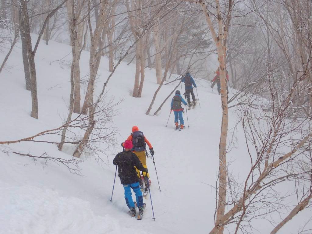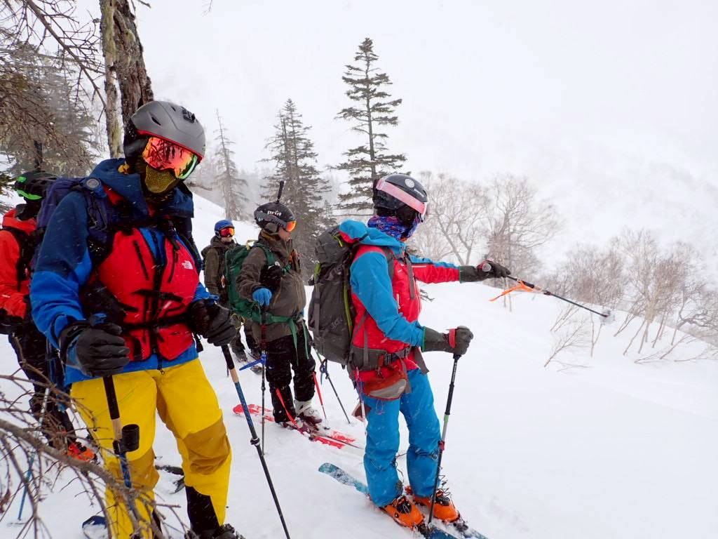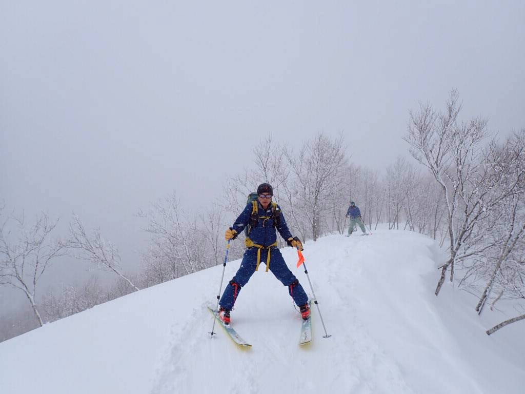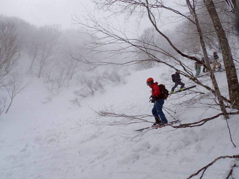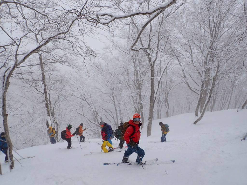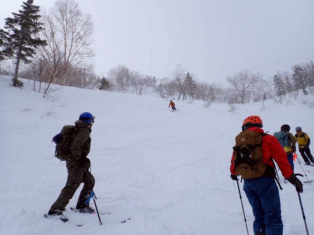 ここでリーダーが的確に判断し、スキーを外して安全に下降。別のラインでは「横滑りで行けそう」と判断したメンバーもおり、それぞれが状況に応じた動きを選択しながら、慎重に下った。