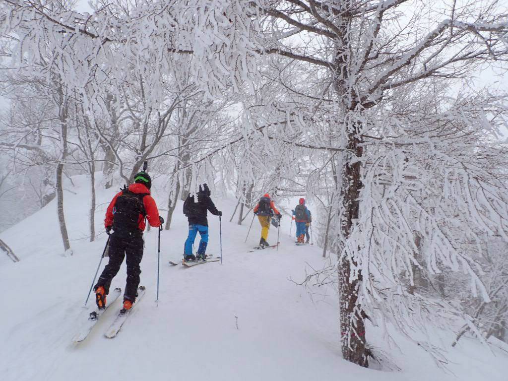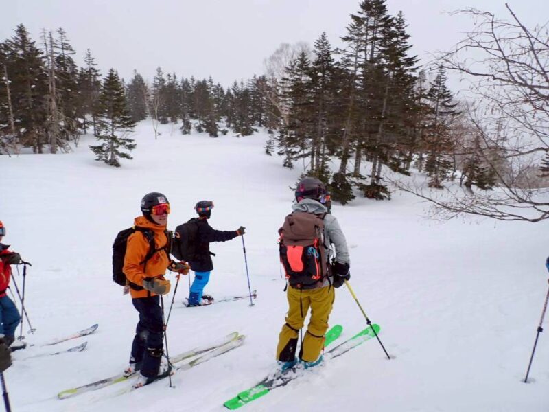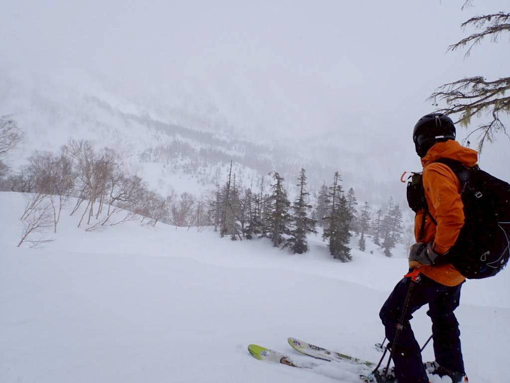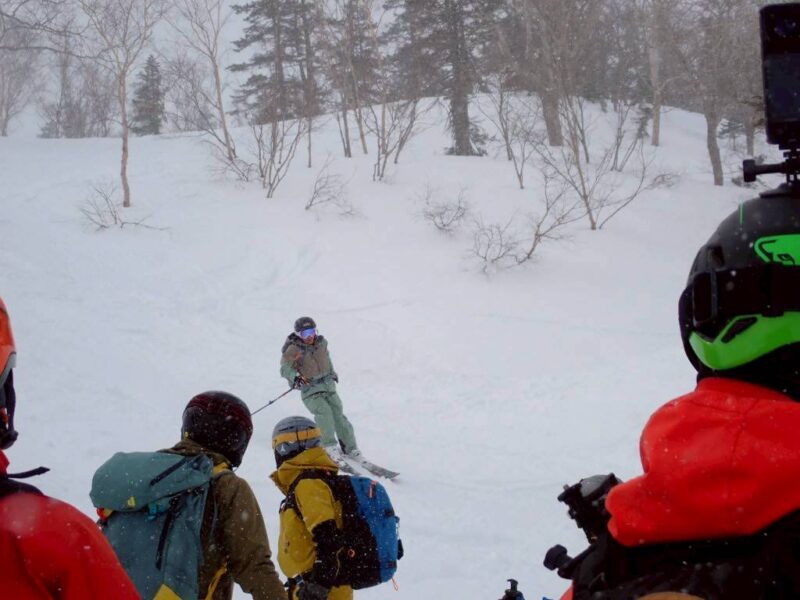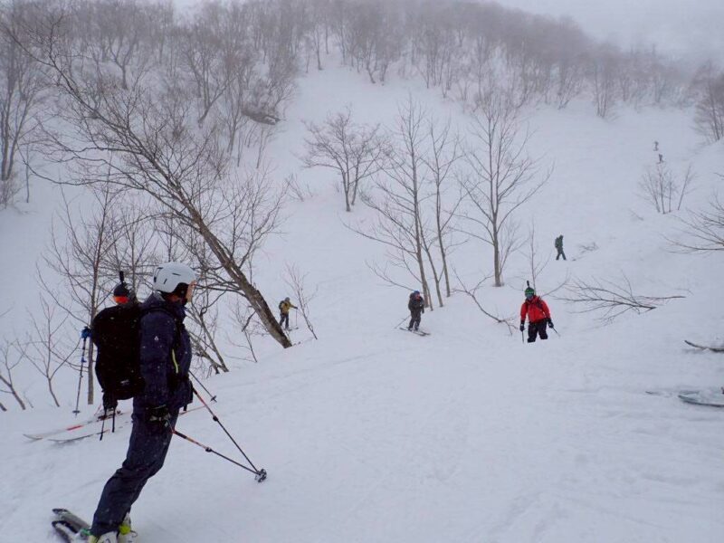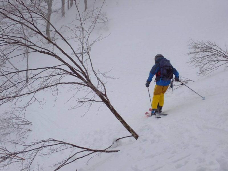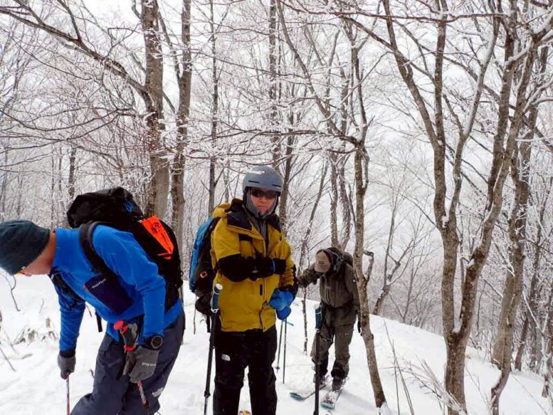 ここでリーダーが的確に判断し、スキーを外して安全に下降。別のラインでは「横滑りで行けそう」と判断したメンバーもおり、それぞれが状況に応じた動きを選択しながら、慎重に下った。