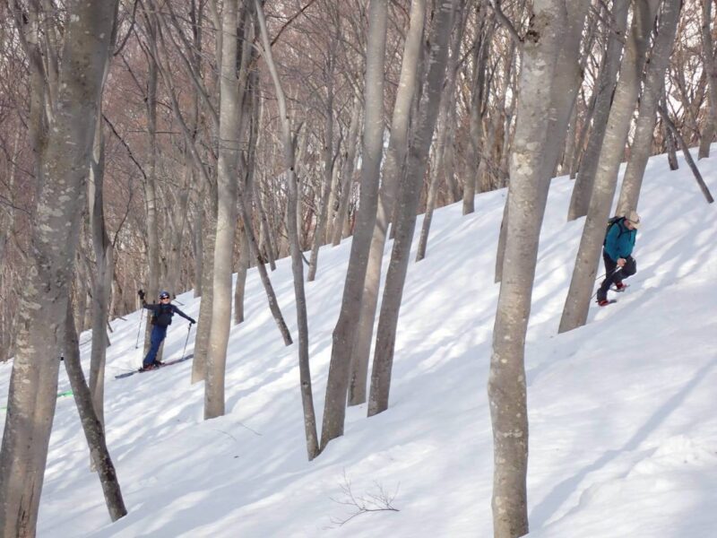 標高を下げるにつれて雪は緩み、次第にシャーベット状の重い雪へと変化。春山らしいコンディションとなるが、慎重にラインをつなぎながら無事に下山。