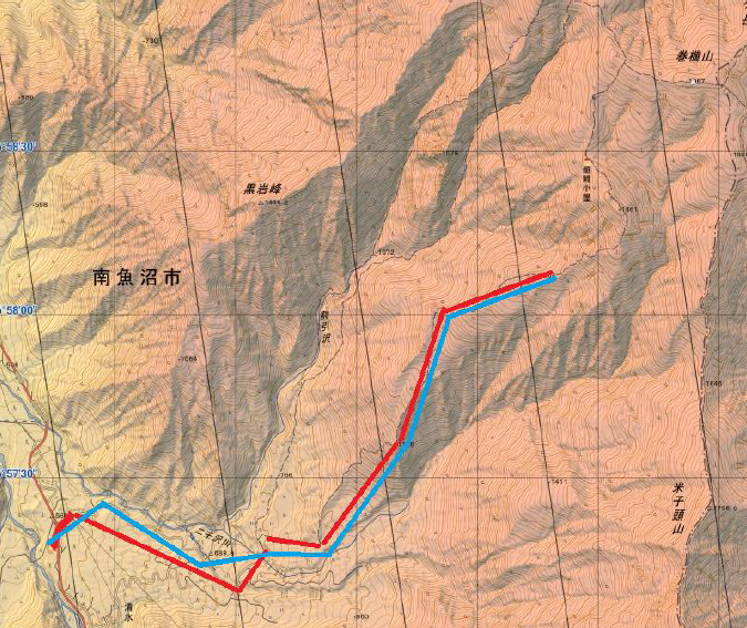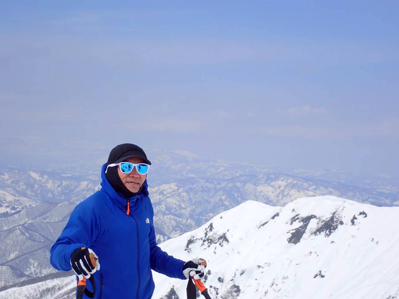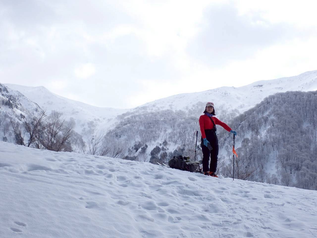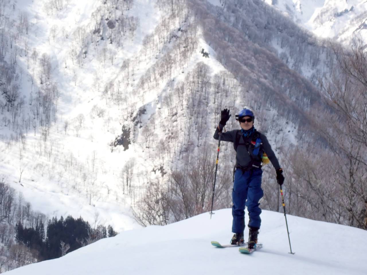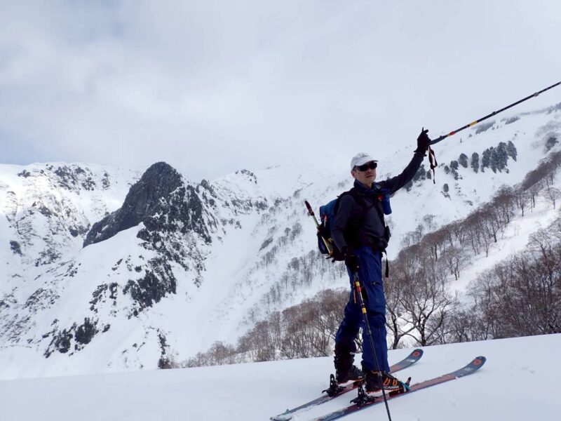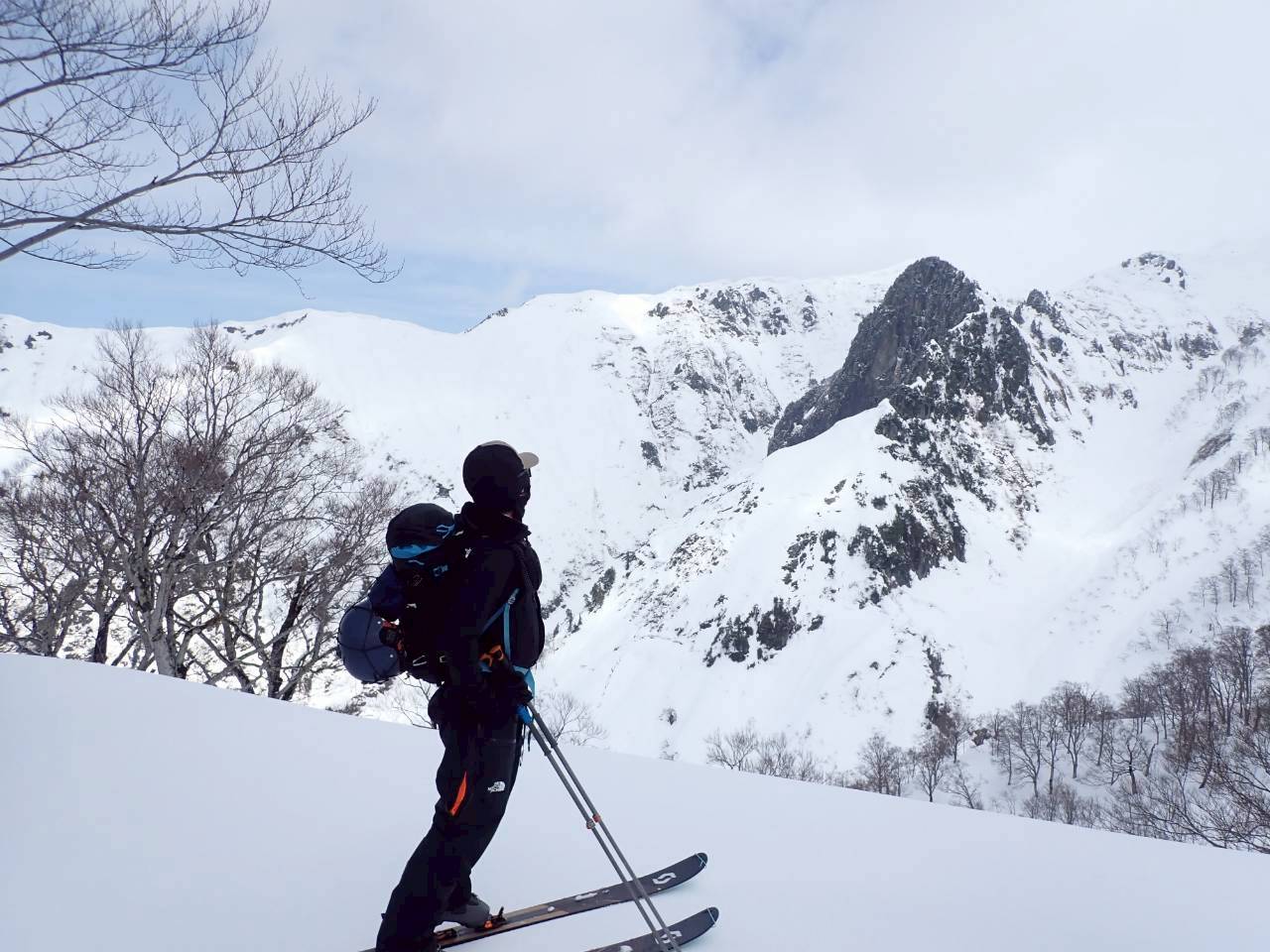 当初は山頂から米子沢への滑走を予定していたが、現地の状況は想像以上に雪が少なく、滝には穴が開き、沢筋も露出している状態。安全を最優先し、計画を変更してピストンルートとした。
