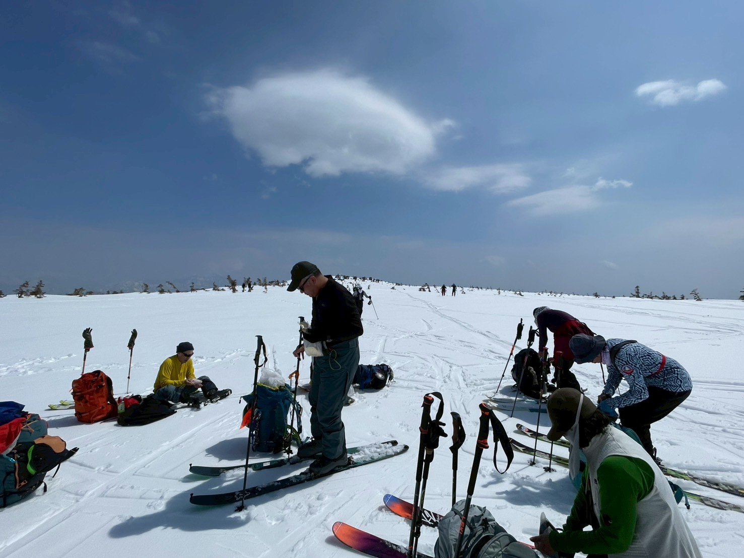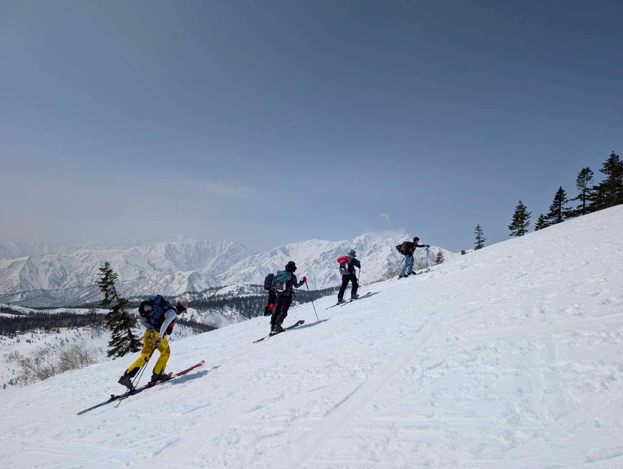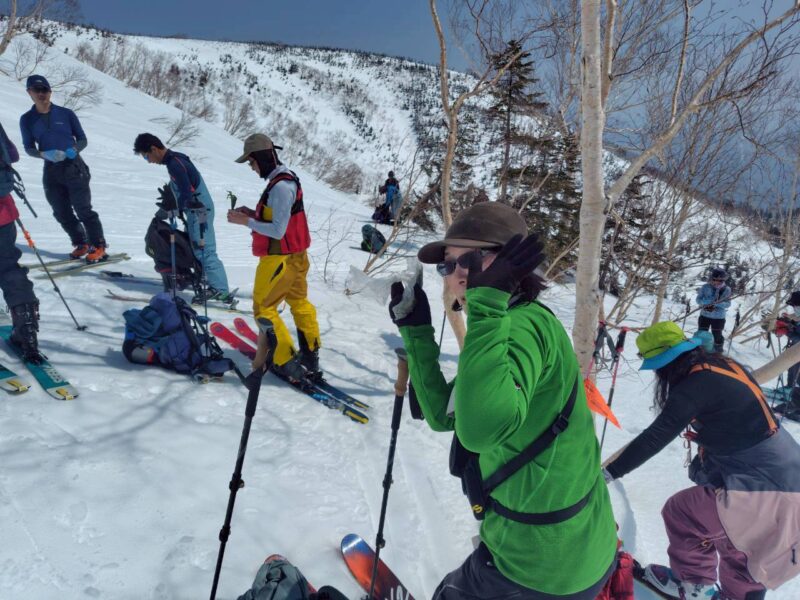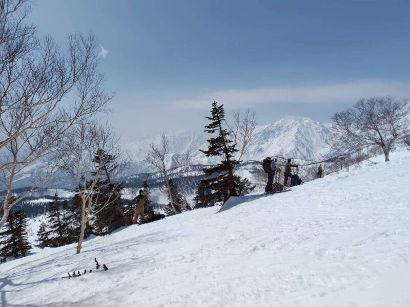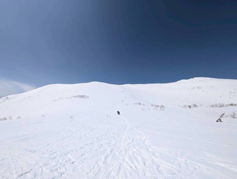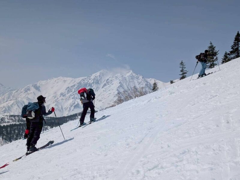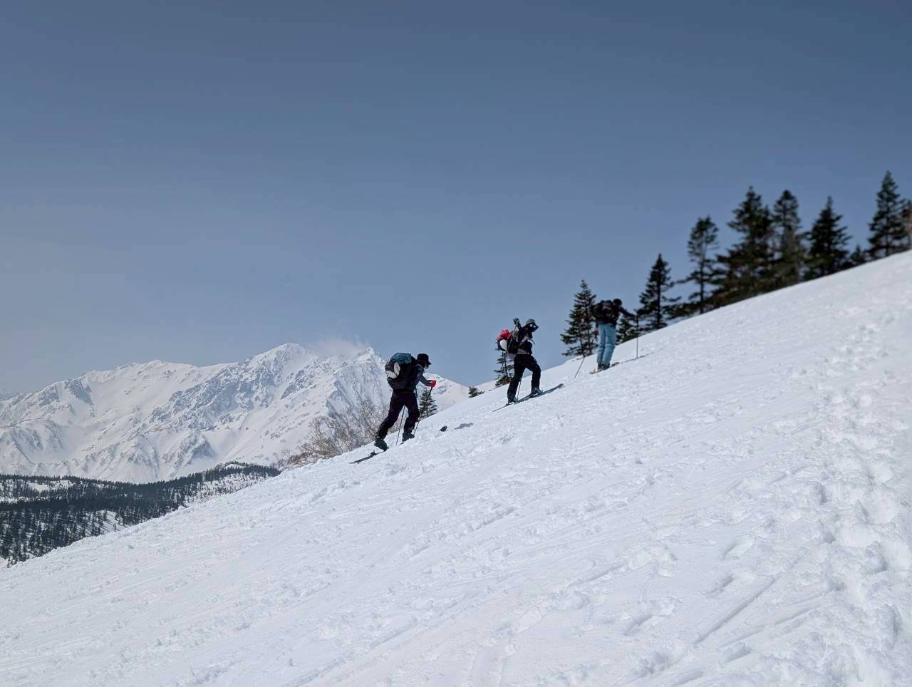 途中、白馬乗鞍の大斜面では複数のパーティーが登行しており、活気ある山の雰囲気を感じる場面もあった。登行中には、上部からスノーボードが流れてくるハプニングもあったが、幸い大事には至らず、後に無事回収された。