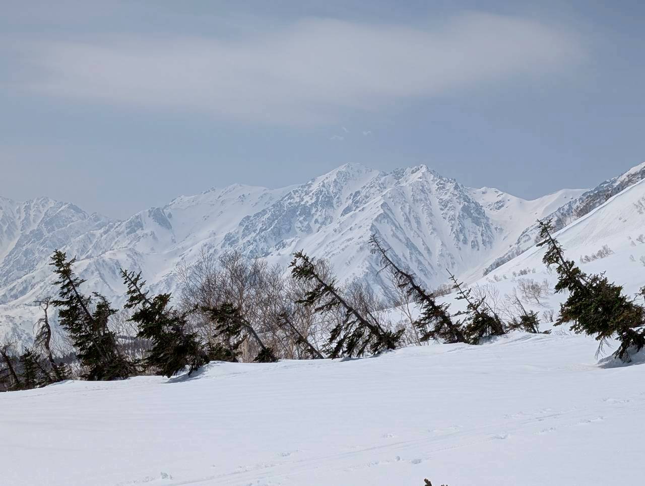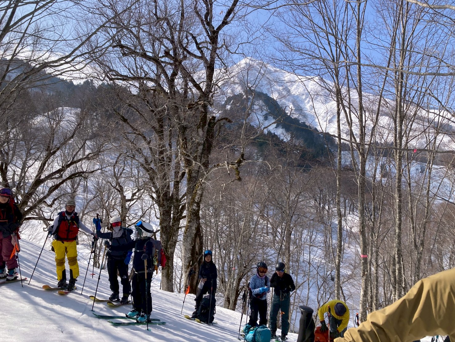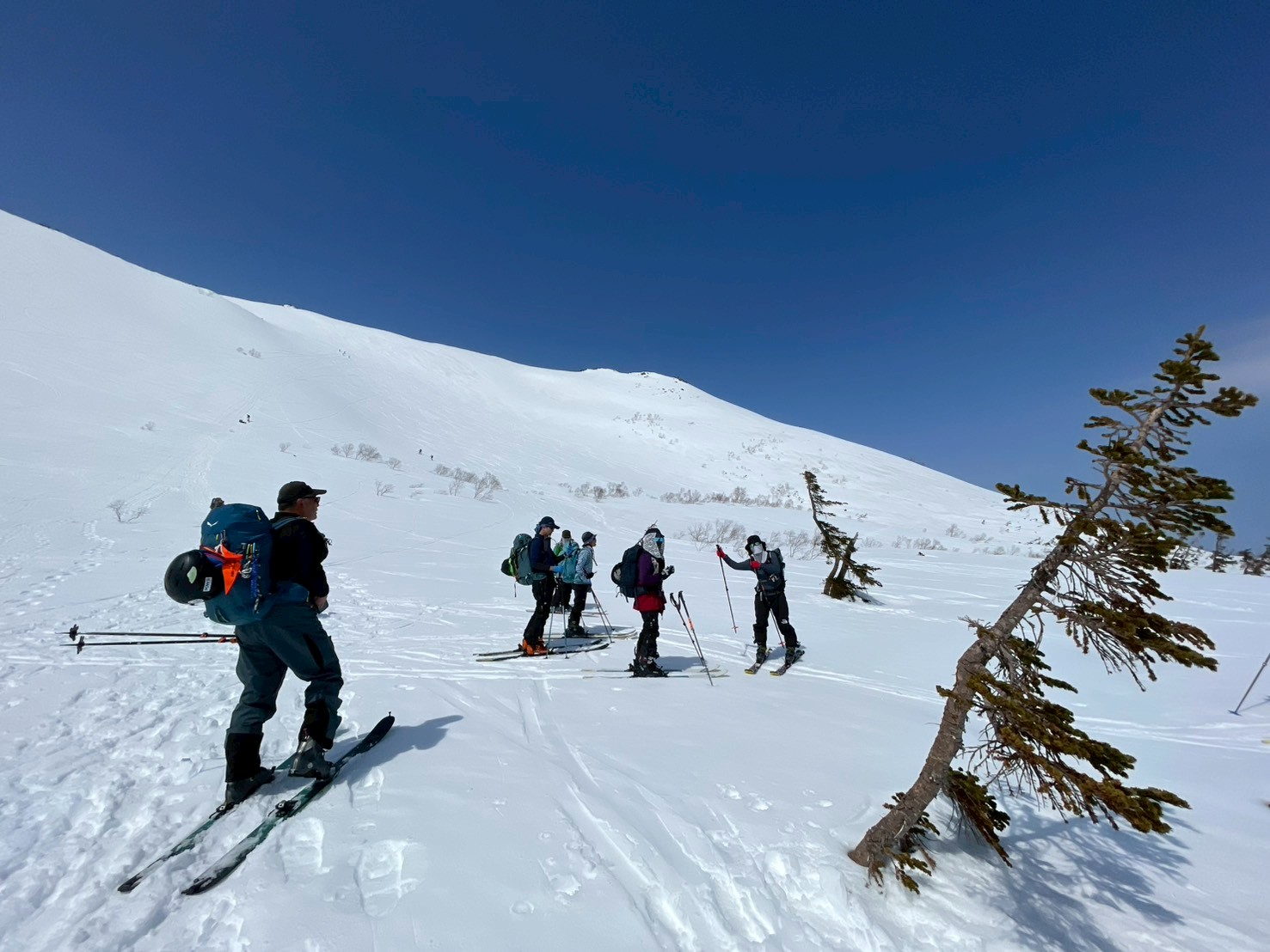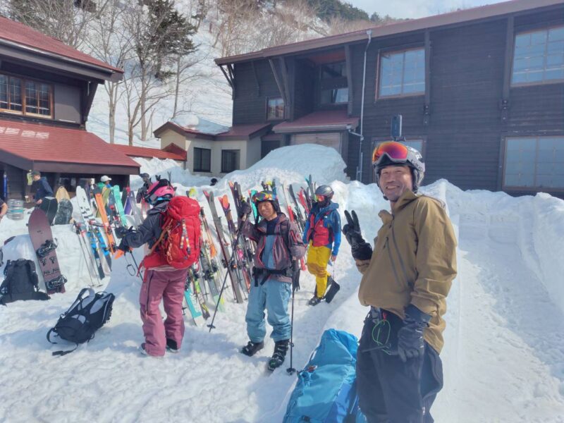 途中、白馬乗鞍の大斜面では複数のパーティーが登行しており、活気ある山の雰囲気を感じる場面もあった。登行中には、上部からスノーボードが流れてくるハプニングもあったが、幸い大事には至らず、後に無事回収された。