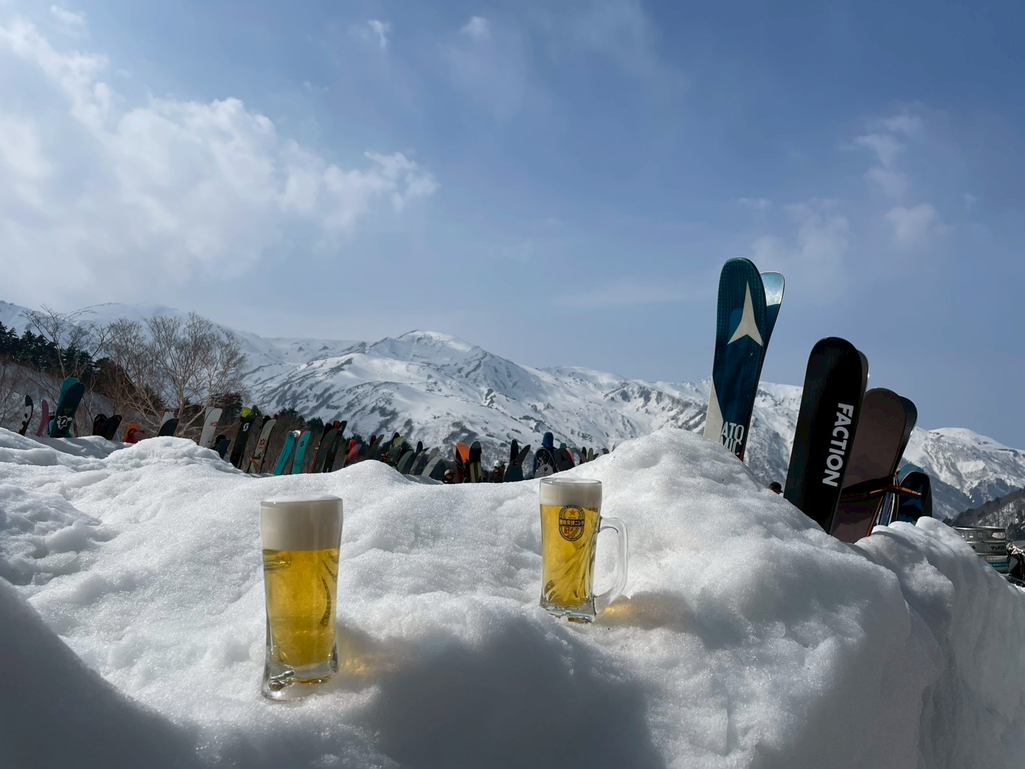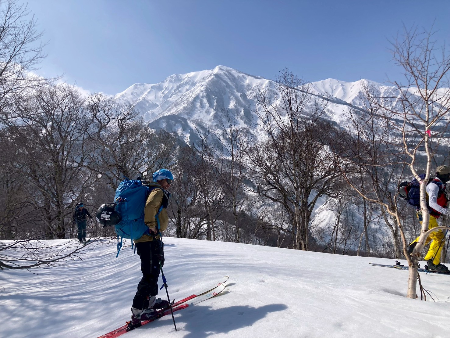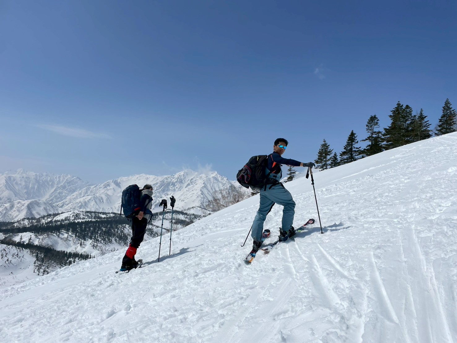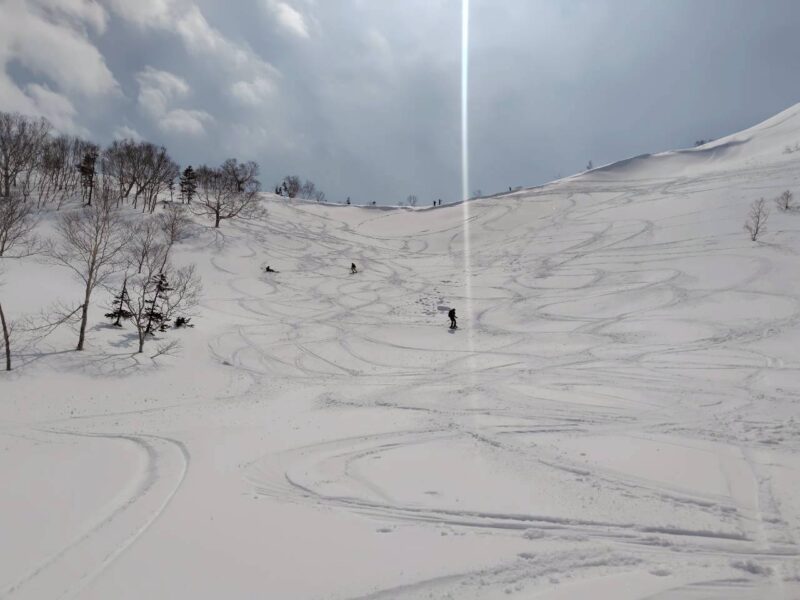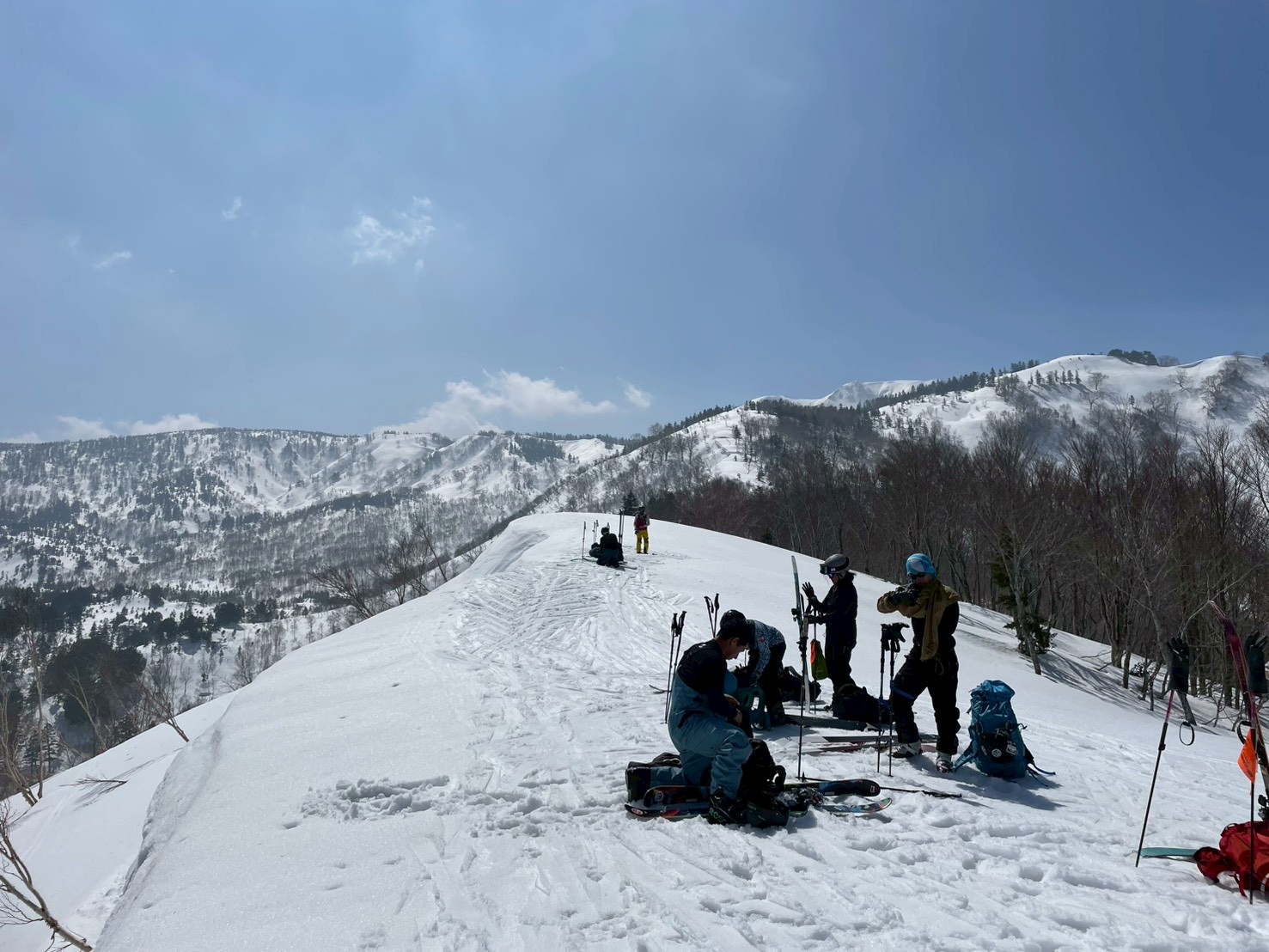 途中、白馬乗鞍の大斜面では複数のパーティーが登行しており、活気ある山の雰囲気を感じる場面もあった。登行中には、上部からスノーボードが流れてくるハプニングもあったが、幸い大事には至らず、後に無事回収された。