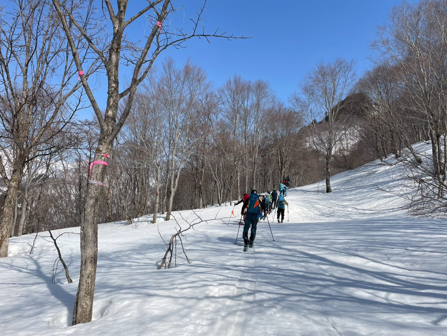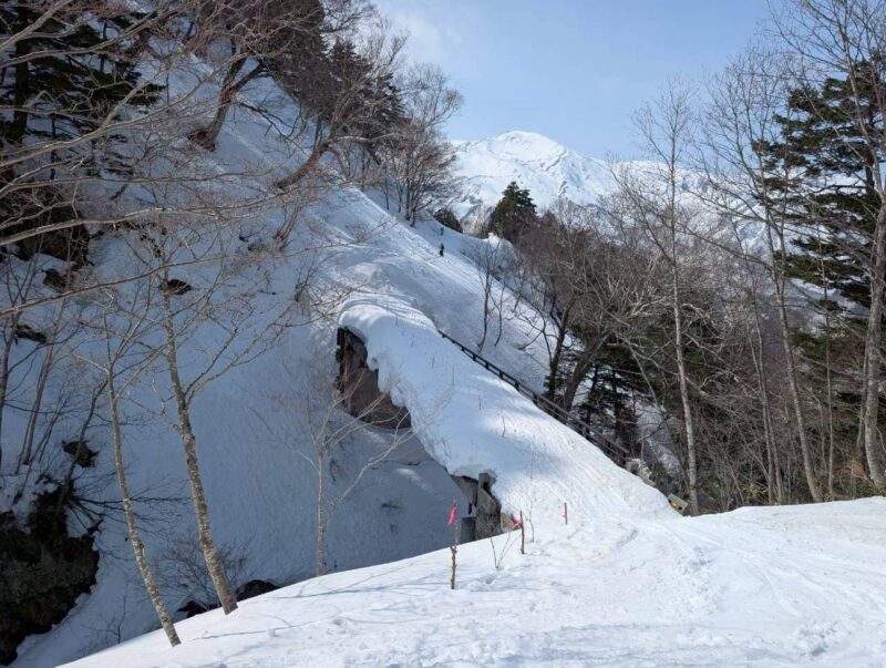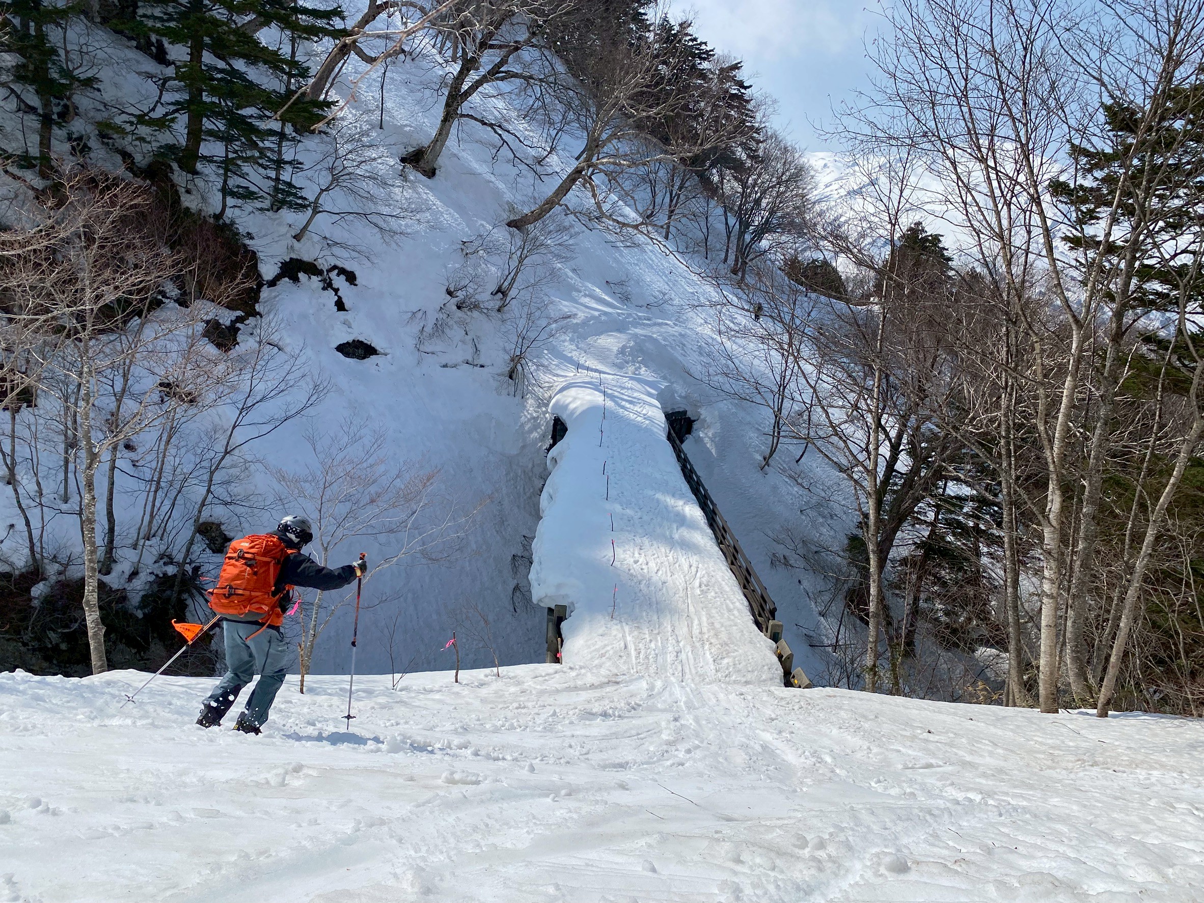 再びシール登行に切り替え、緩斜面を登り返して林道へ。途中には大きなデブリもあり、林道であっても雪崩のリスクを感じる場面があった。