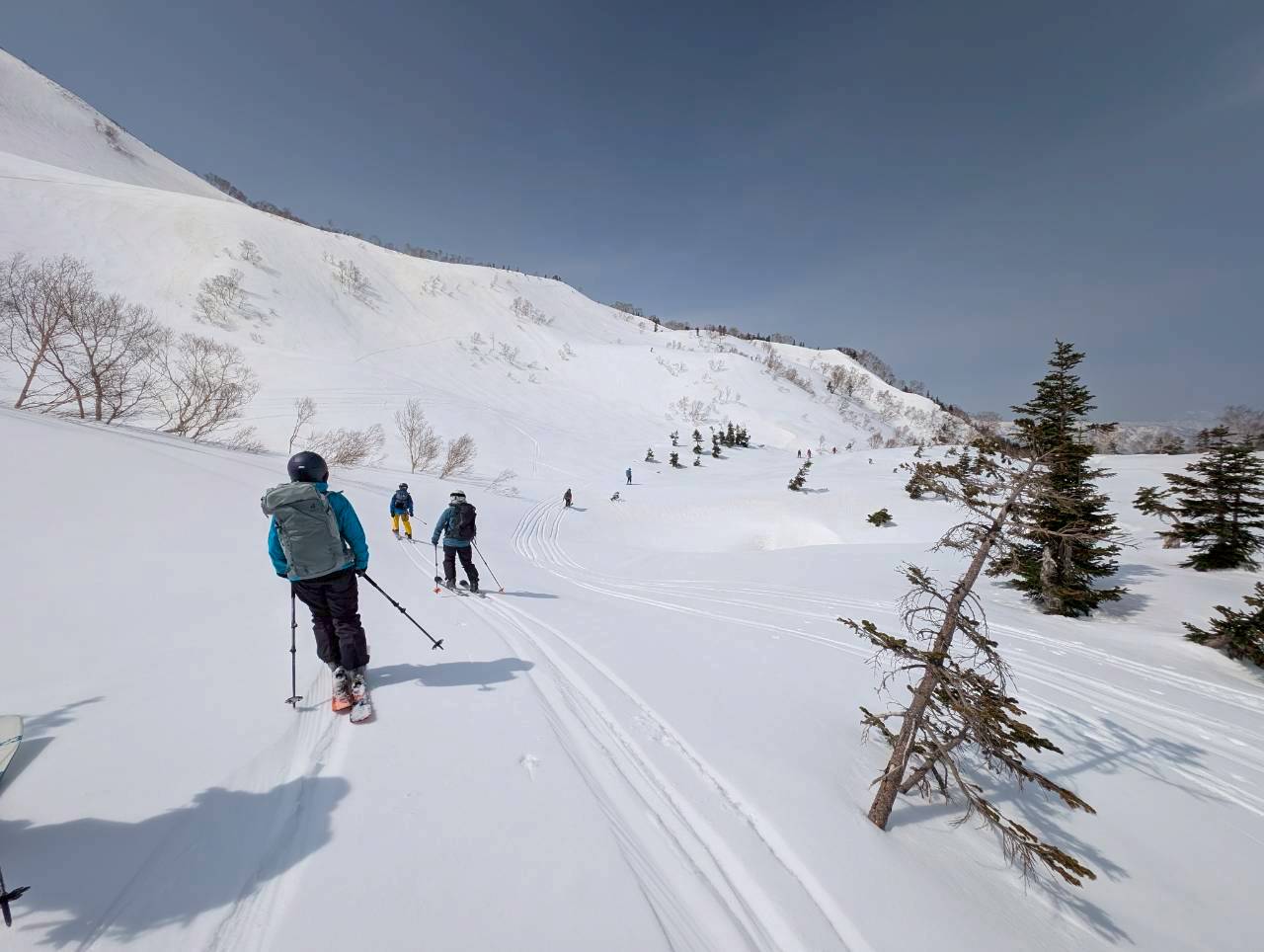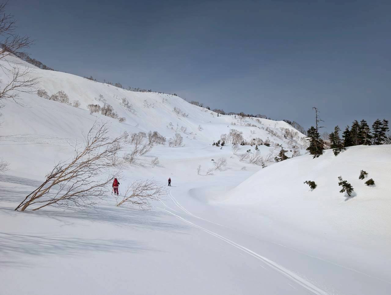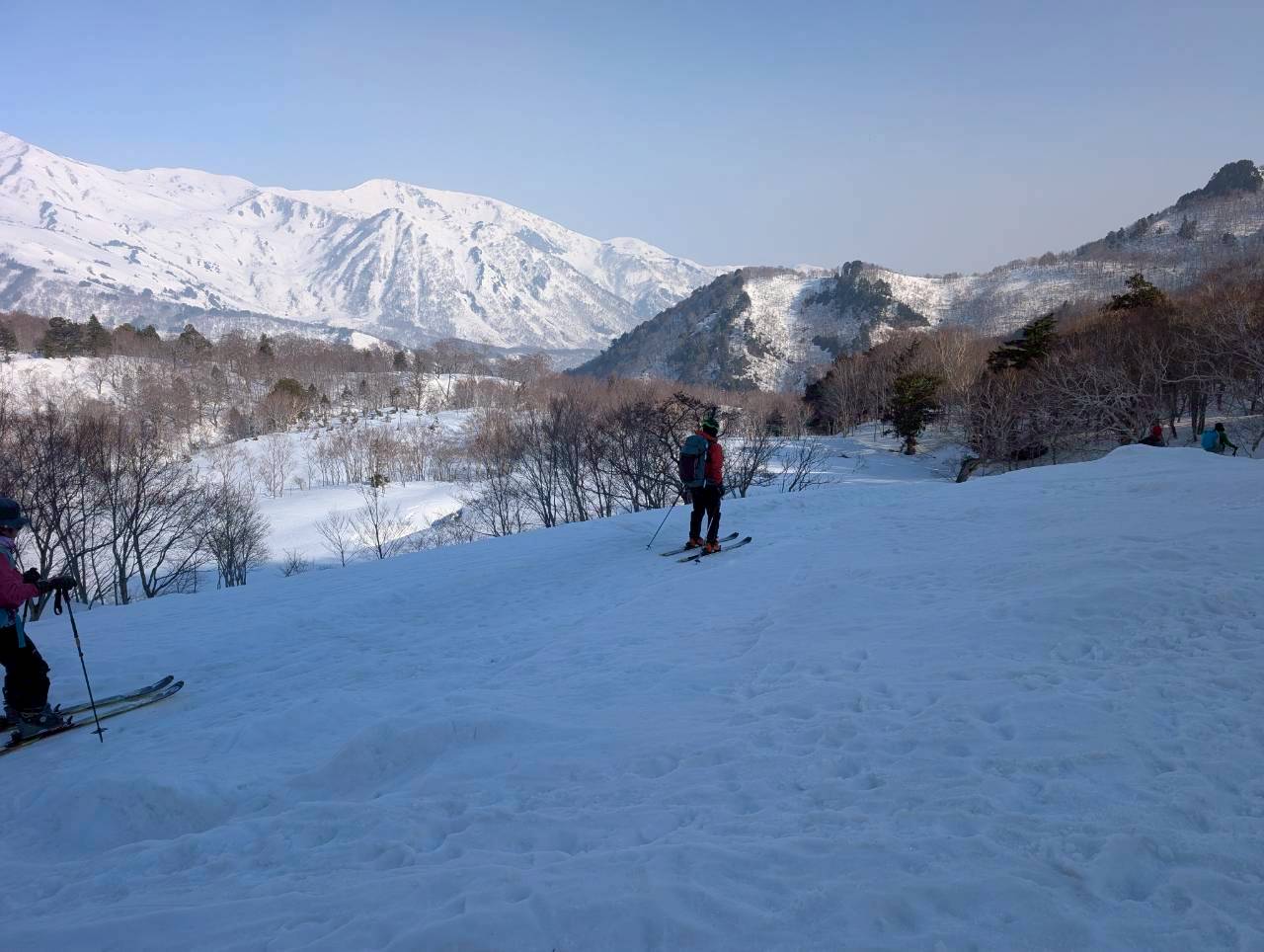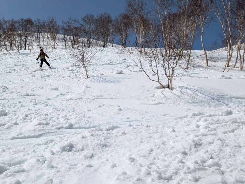 天狗原から振子沢へドロップ。上部は広く滑りやすい斜面だが、気温の高さから雪は重め。日陰では急に雪質が変わるため、スピードコントロールに気を配りながら慎重に滑走する。