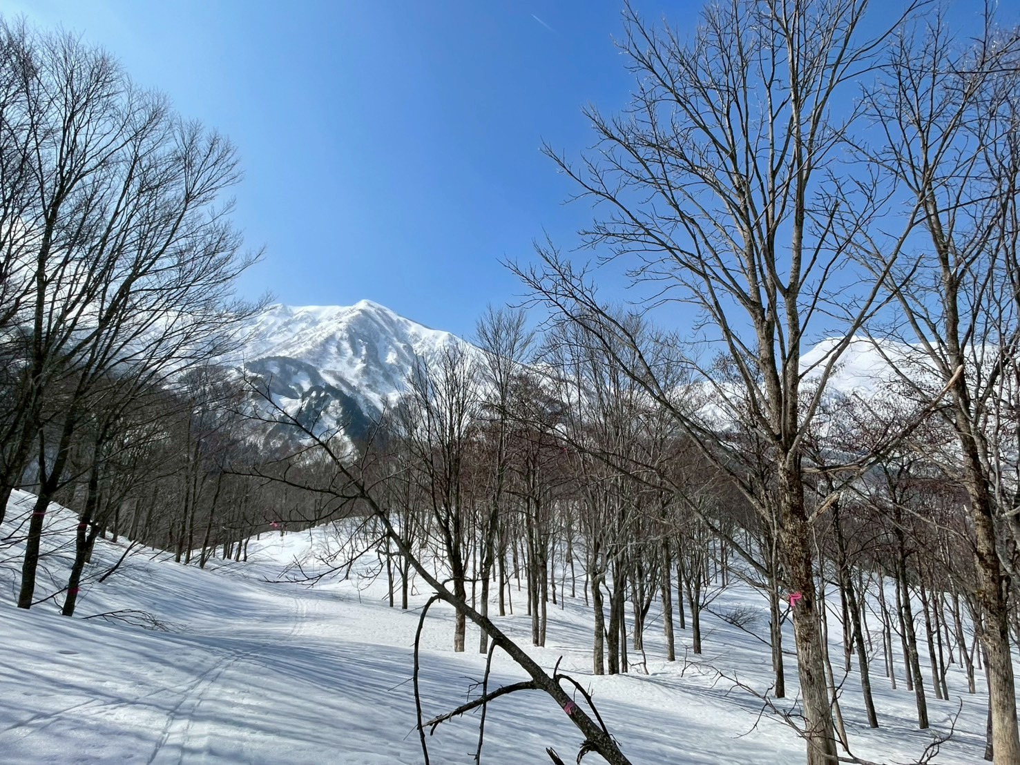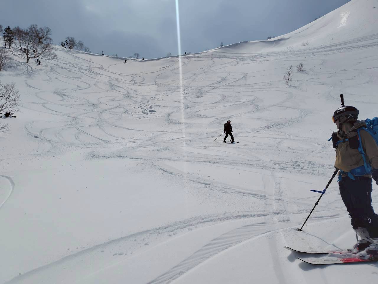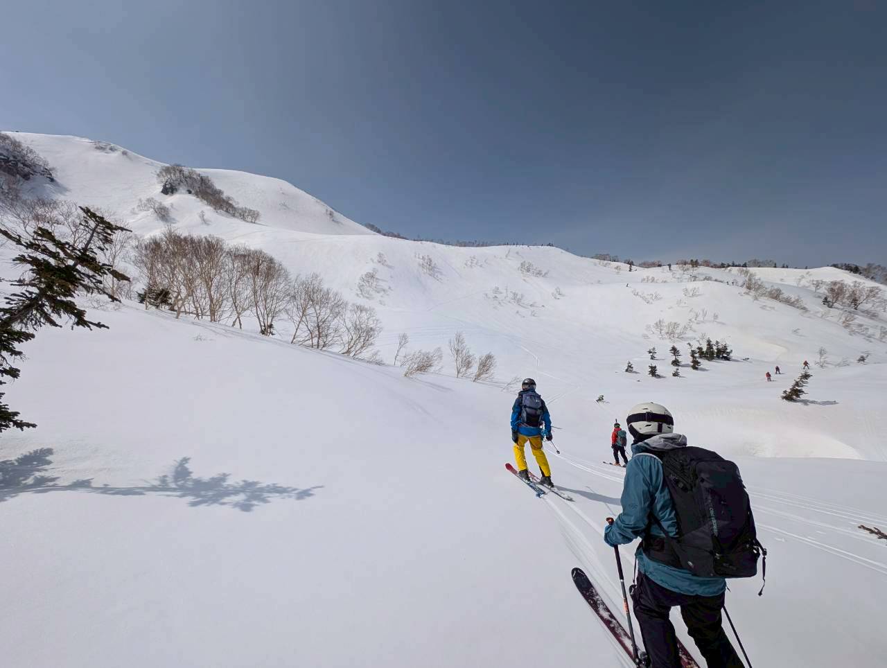 天狗原から振子沢へドロップ。上部は広く滑りやすい斜面だが、気温の高さから雪は重め。日陰では急に雪質が変わるため、スピードコントロールに気を配りながら慎重に滑走する。