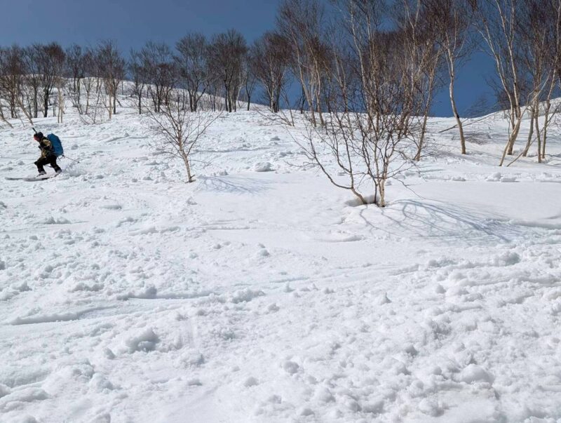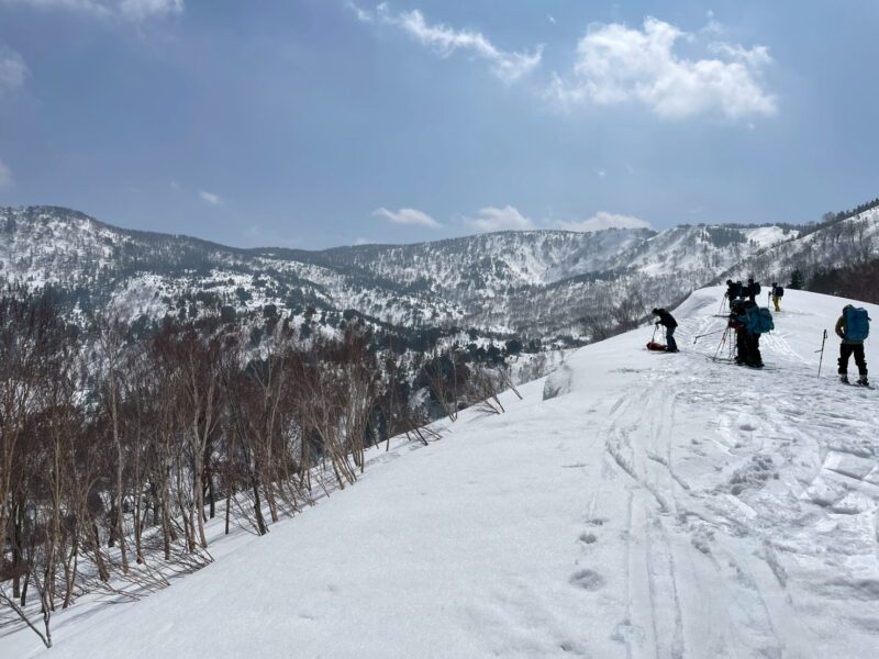 峠でしっかりと休憩を取った後、ウド川源流へ向けて滑走開始。稜線直下では雪庇の影響による表層雪崩の痕跡が多数あり、緊張感の高い区間となる。安全確保のため、一人ずつ慎重に通過した。