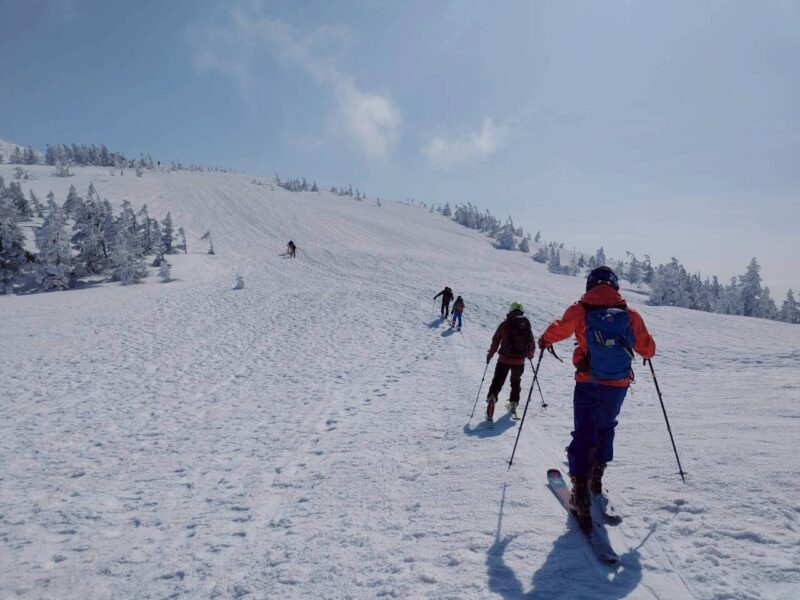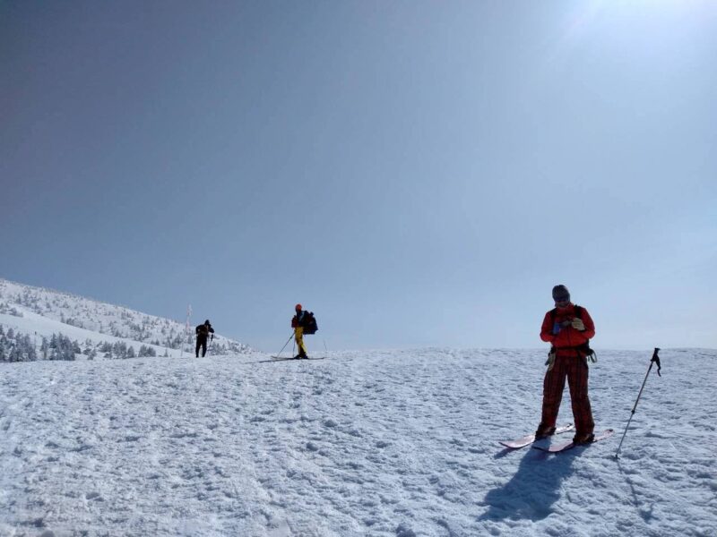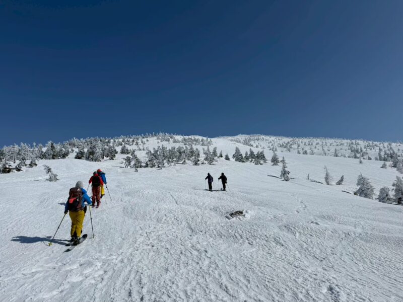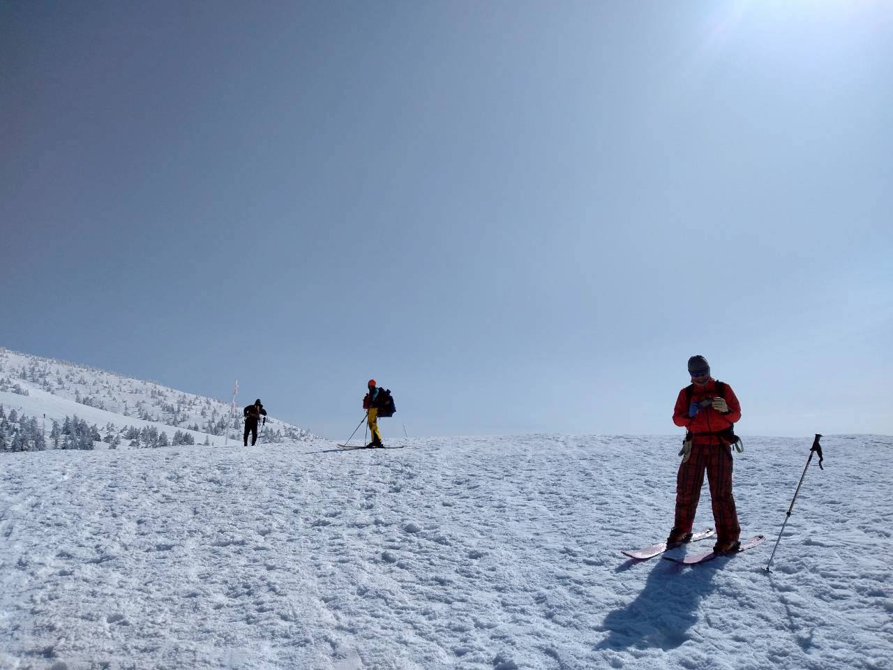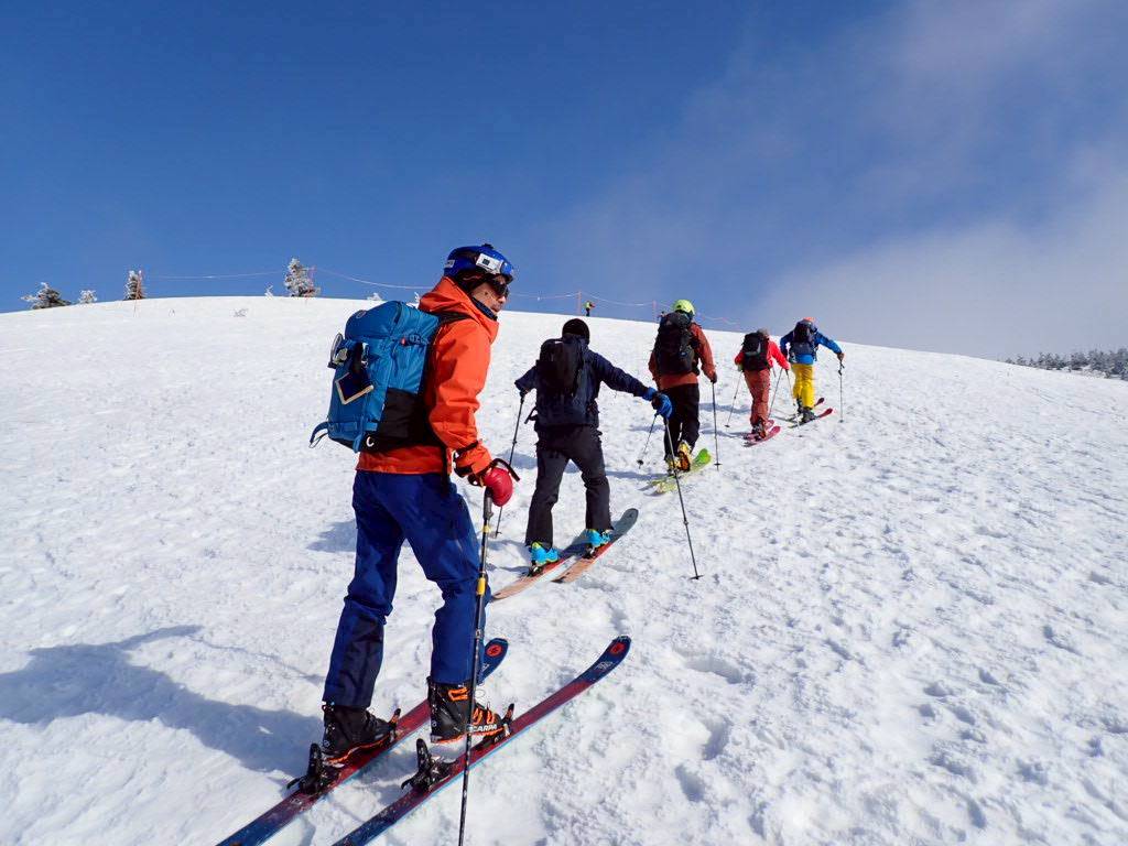 当日は天候に恵まれたため、まずは行けるところまで登り、状況を見ながら滑走ルートを判断する方針でスタート。