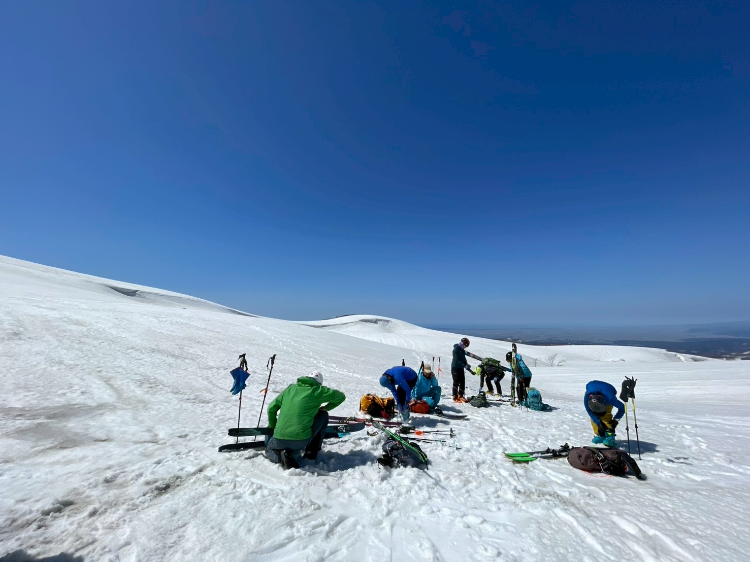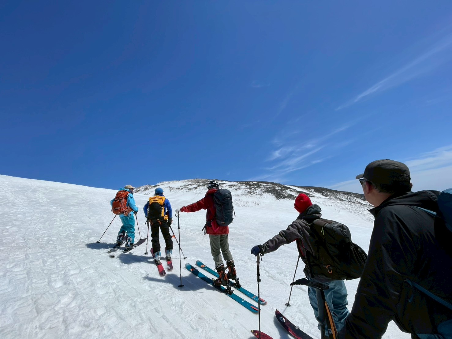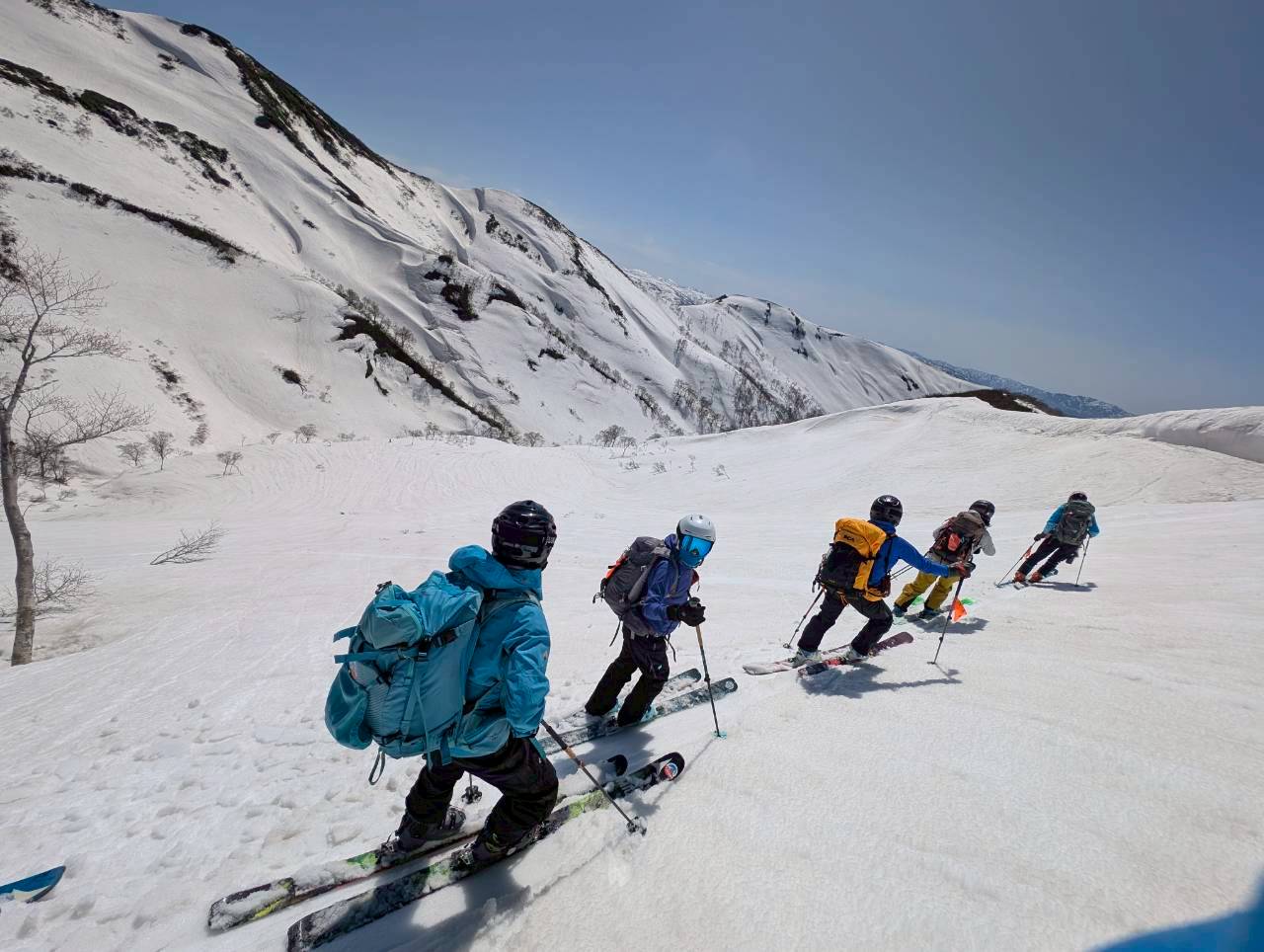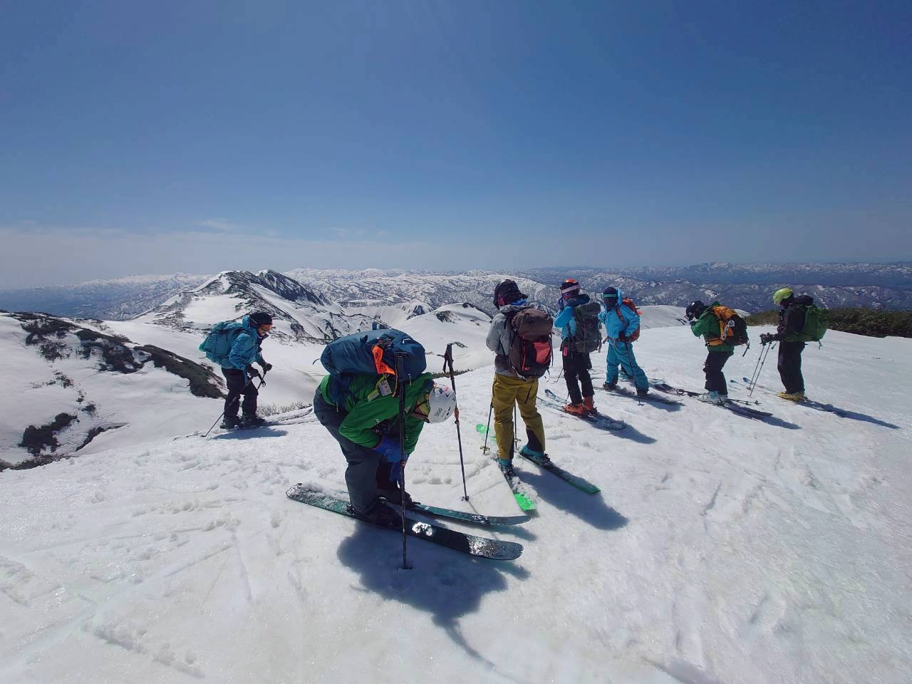 今回の山行は、ガイド2名の的確な判断と案内により、安全にナイフブリッジを通過し、最高のバーンを滑ることができた。