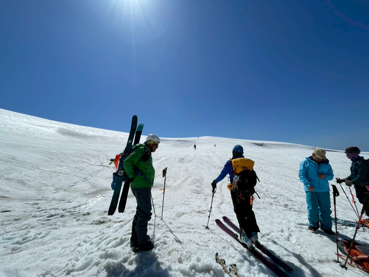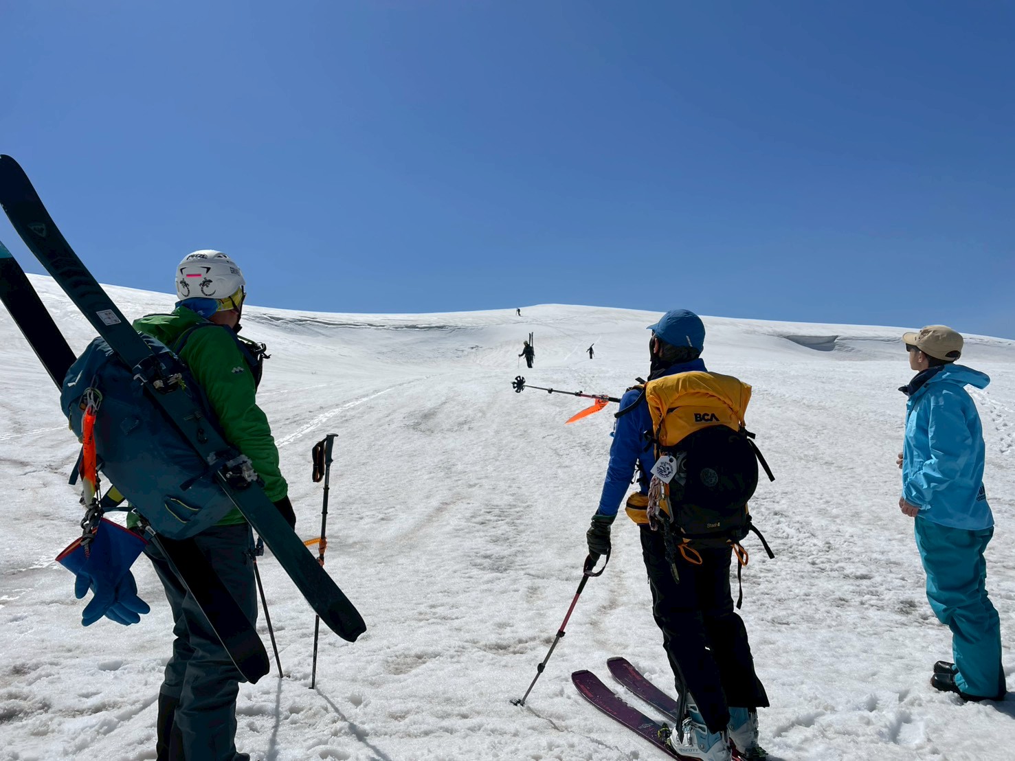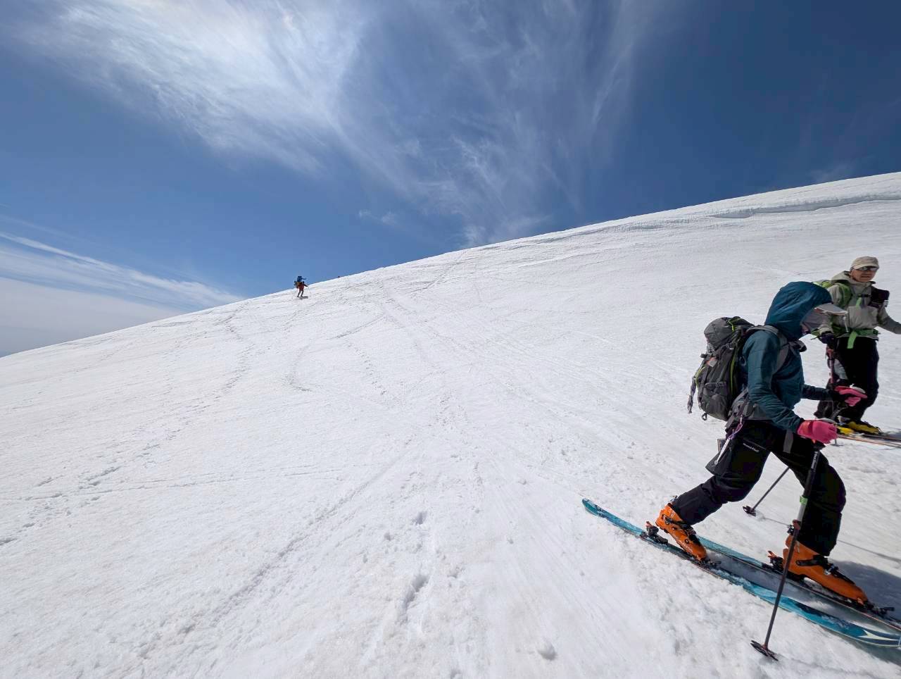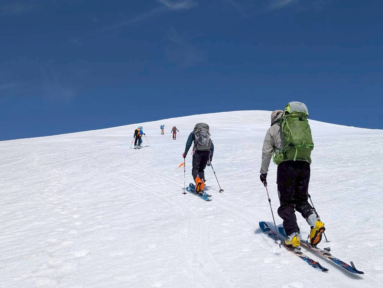 今回の山行は、ガイド2名の的確な判断と案内により、安全にナイフブリッジを通過し、最高のバーンを滑ることができた。