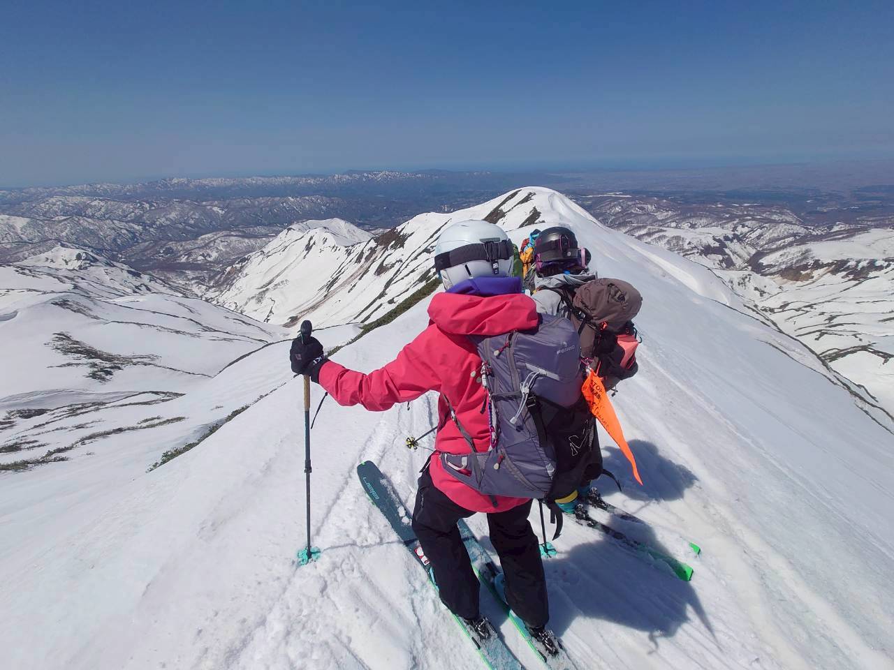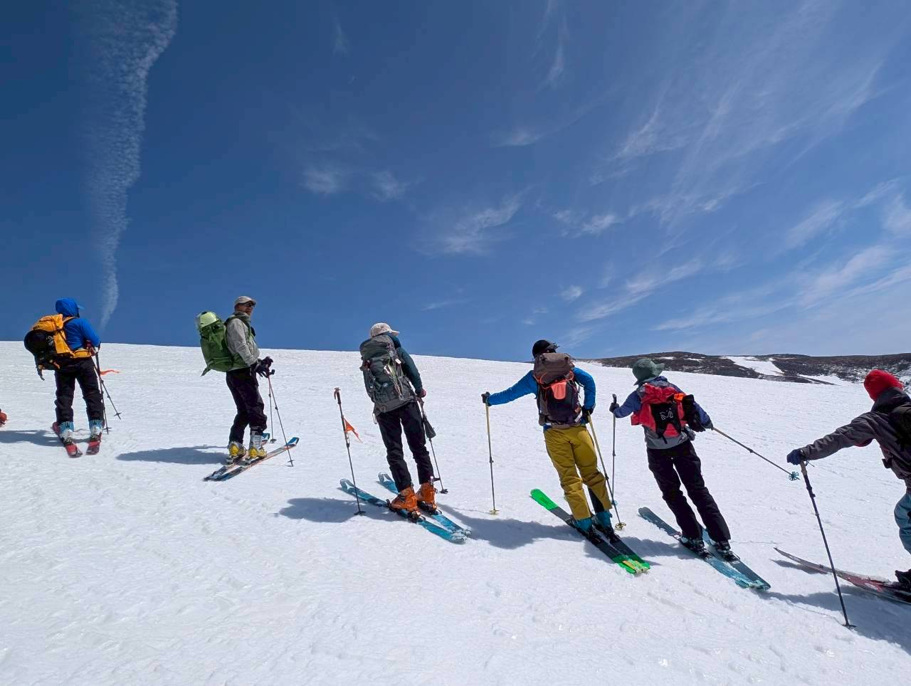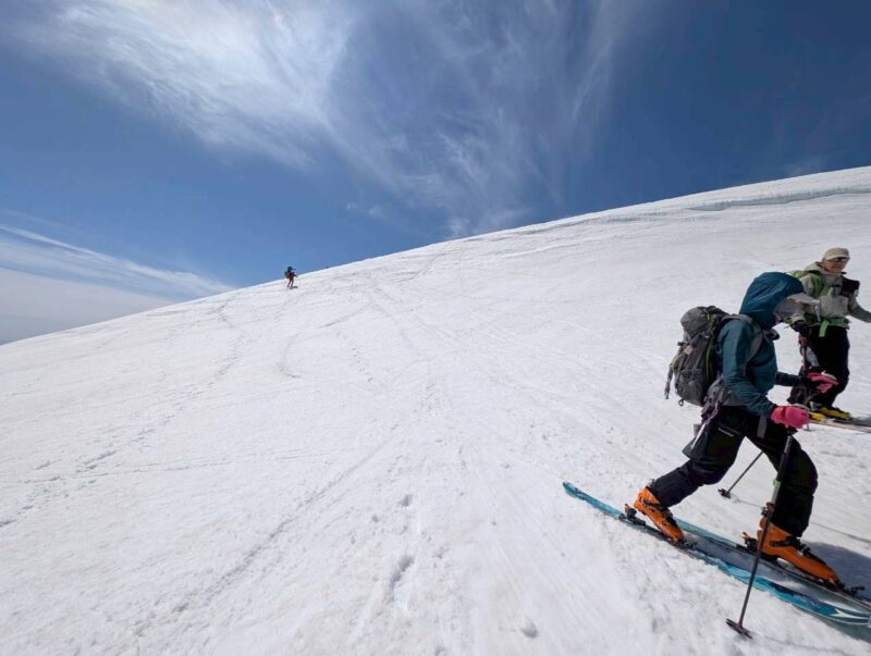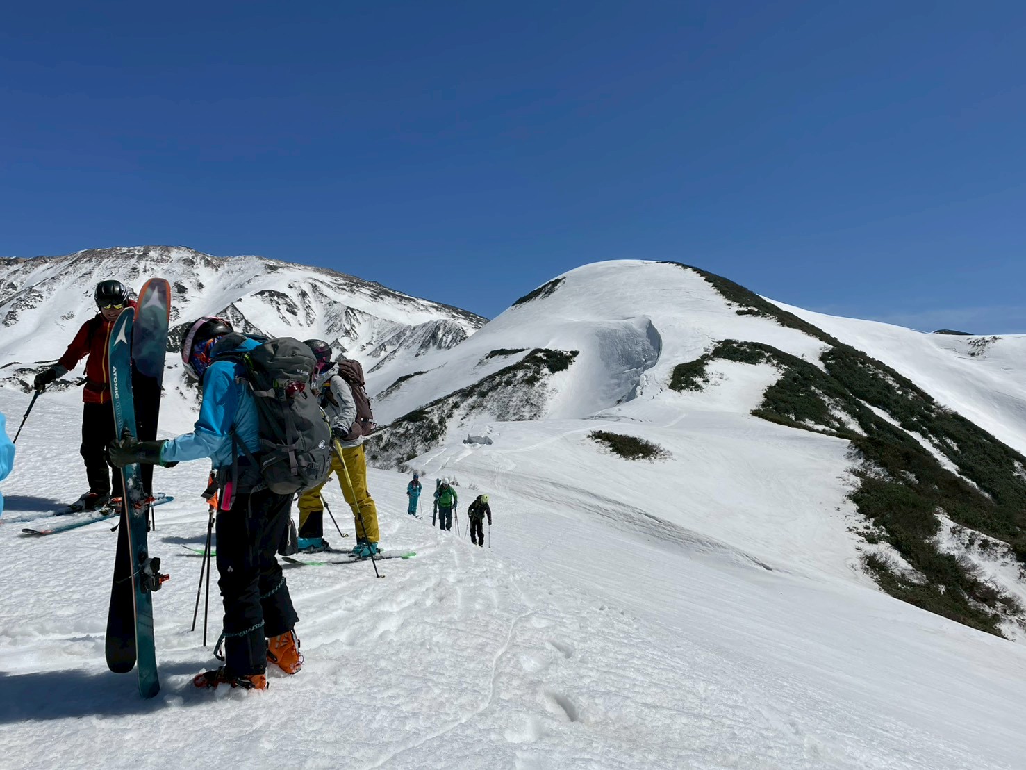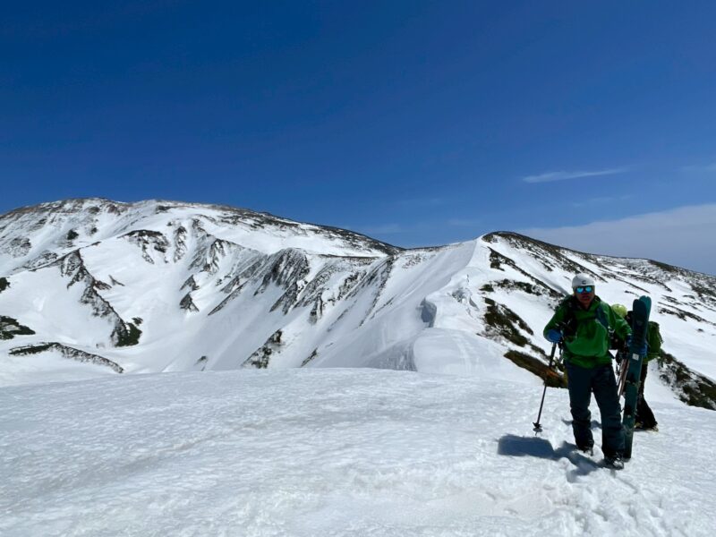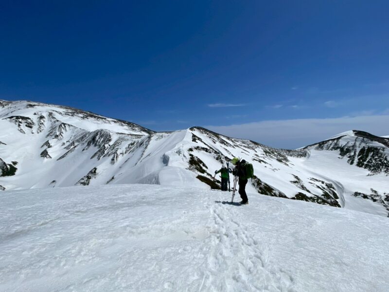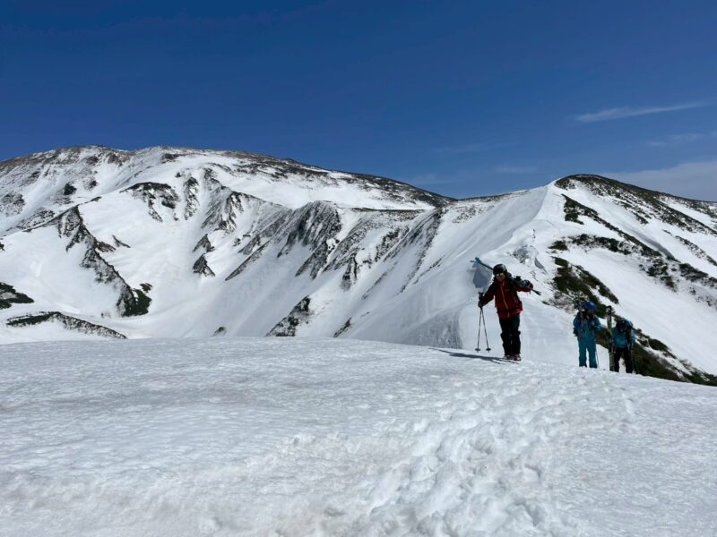 左右は切れ落ち、左側にはクラックも入る緊張感のある地形。慎重に一人ずつ通過する。緊張はあるものの、稜線上を滑る感覚はこれまでにない爽快感で、まさに特別な体験だった。