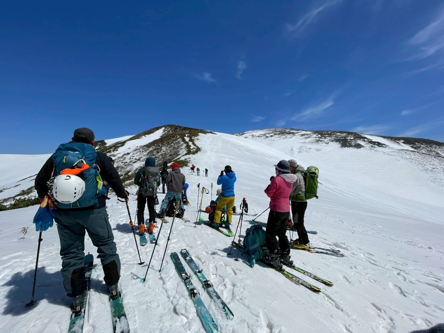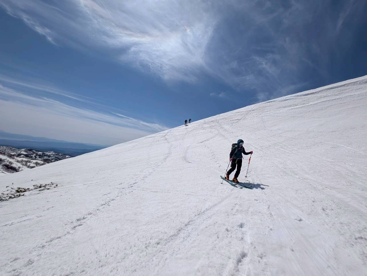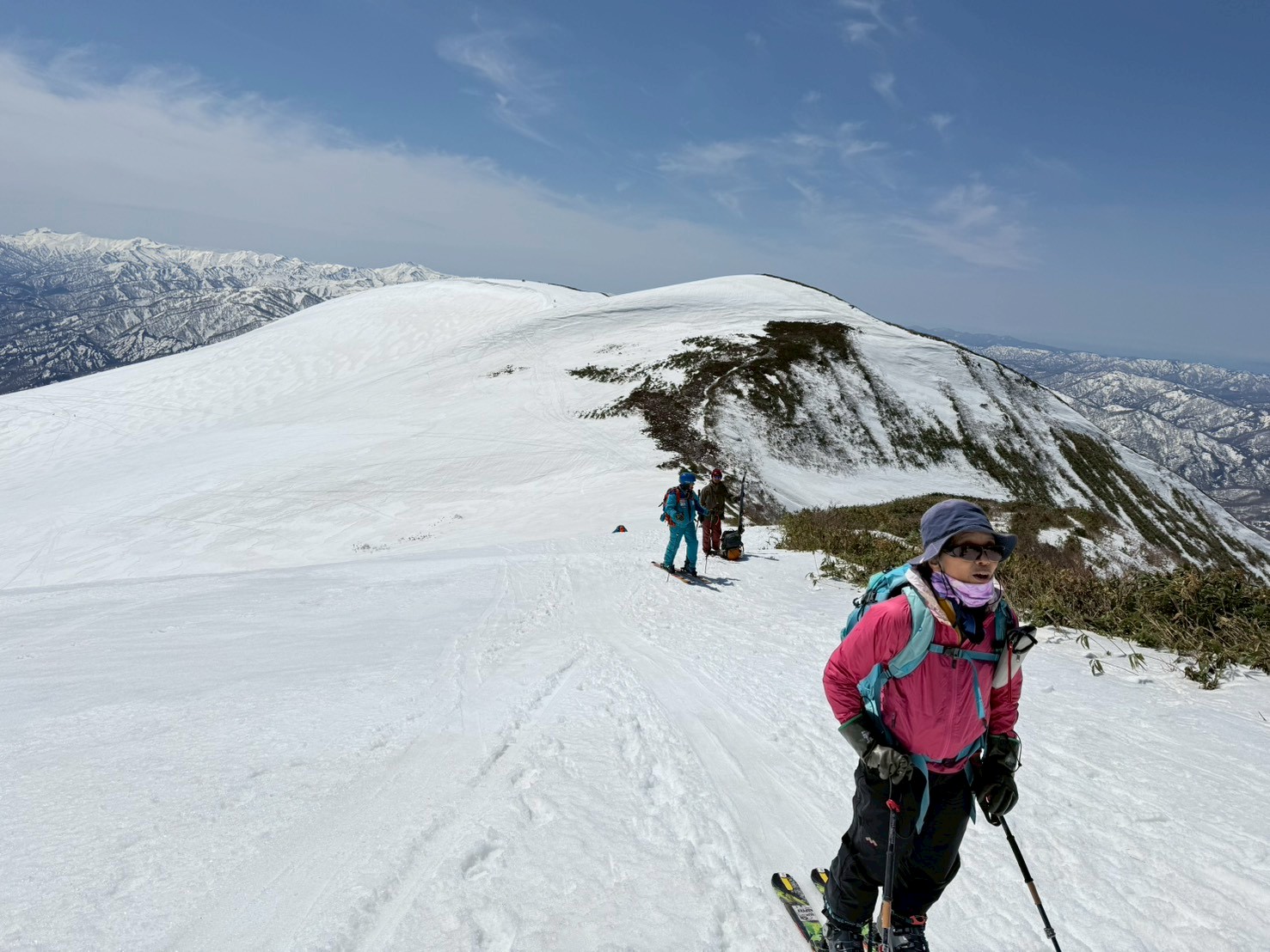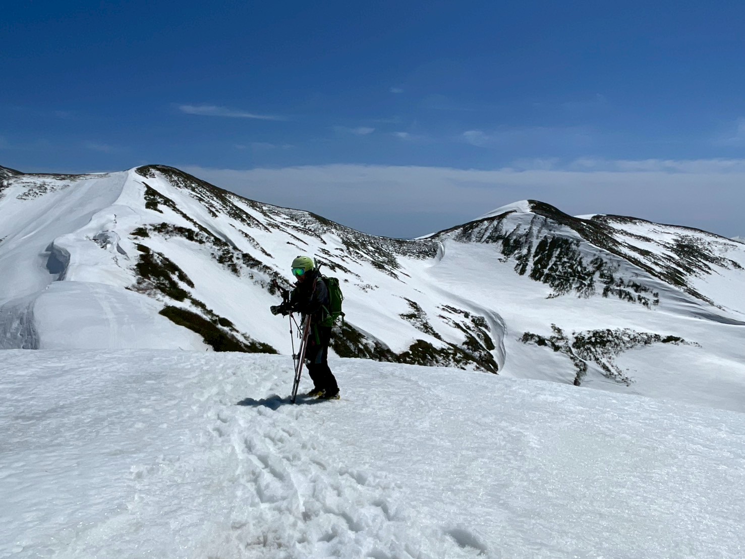 左右は切れ落ち、左側にはクラックも入る緊張感のある地形。慎重に一人ずつ通過する。緊張はあるものの、稜線上を滑る感覚はこれまでにない爽快感で、まさに特別な体験だった。