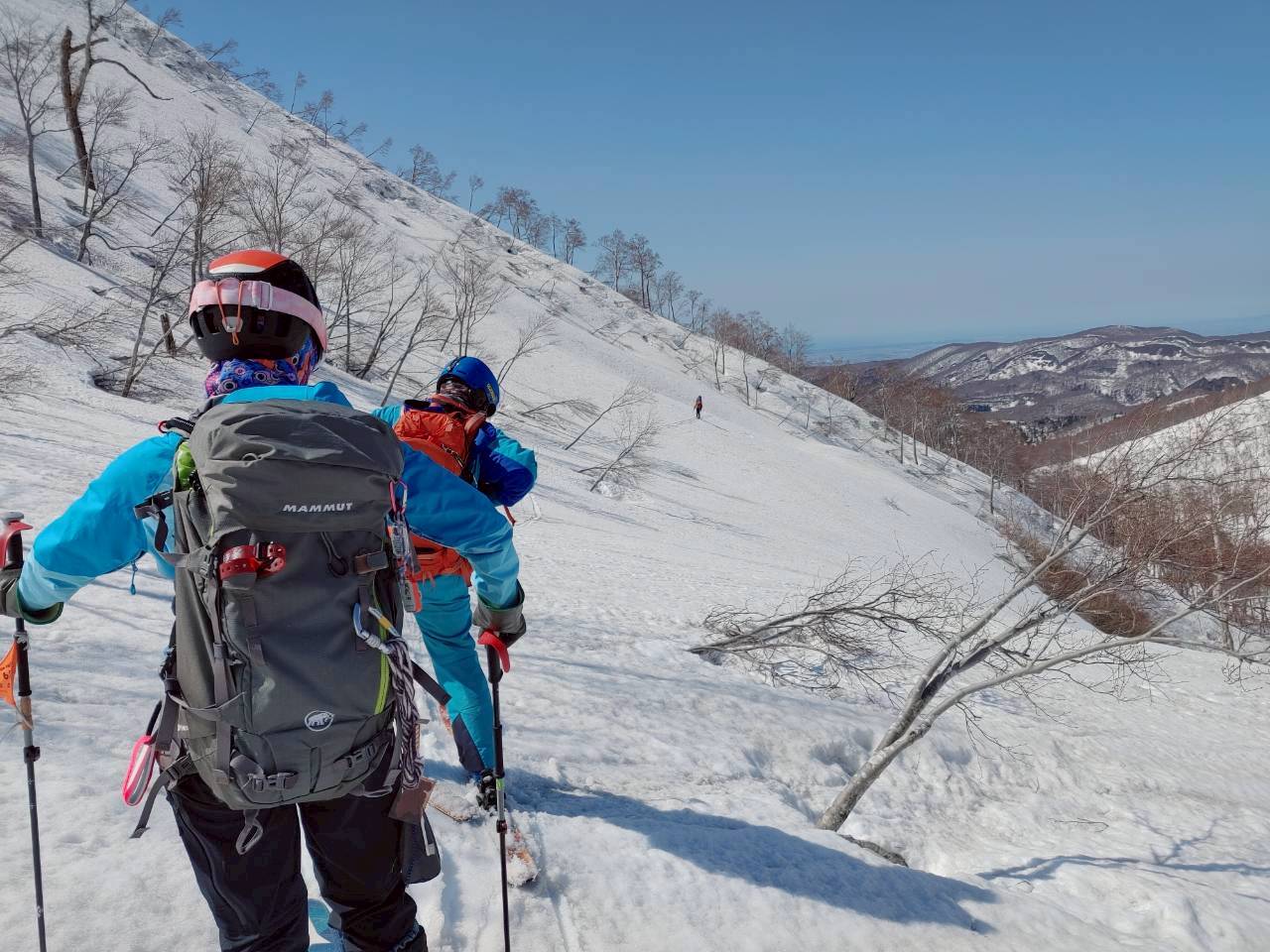 その後も1479m付近までアップダウンを繰り返す。登り返しでは板を担ぐ場面もあり、体力を使う区間となった。